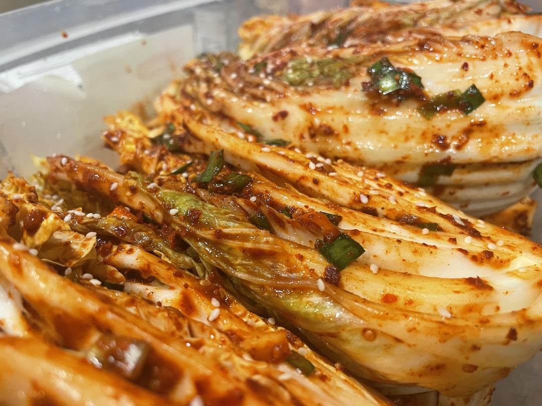 Needs more sauce. The cabbage looks a little stiff – did you leave it in salt water a night ahead? Good try tho! Reminds me of the kimchi that I ate with jjajangmyeon as a kid.