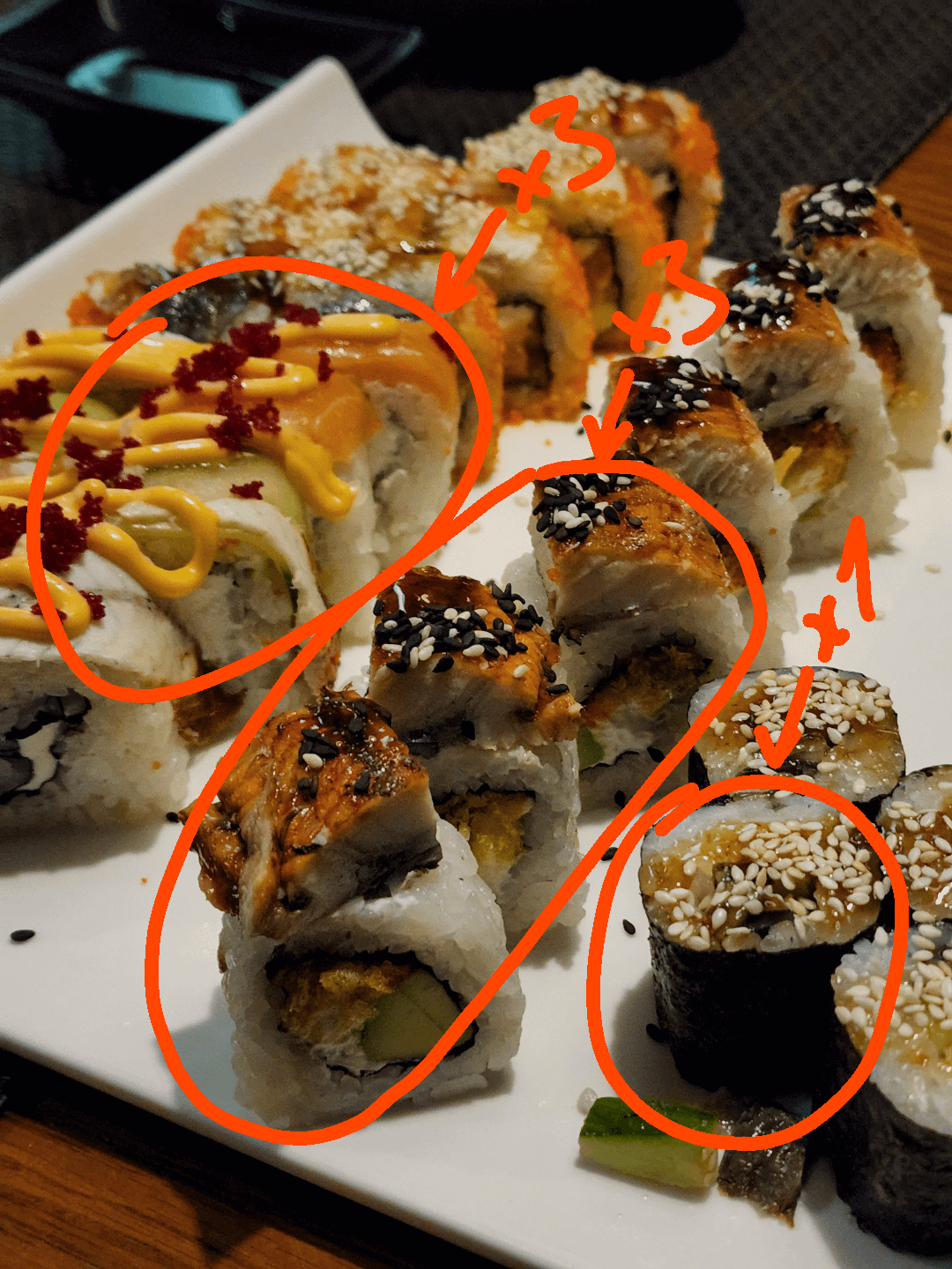 Sushi pieces = 70-80 each for that type