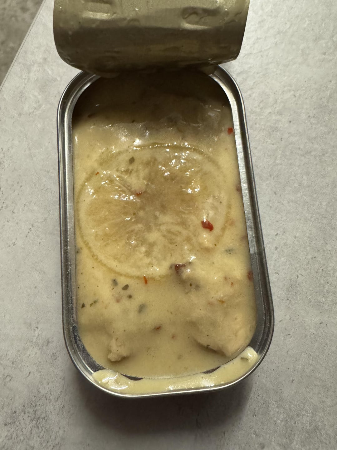Makrele filets in a sauce called Diablesse. I don’t speak french but the store that sold it to me translated it to german -> Teufelsart. Which would translate to something like devils sauce. Ingredients listet mustard, garlic and red pepper. I was expecting a somewhat spicy mustard sauce. In reality what i tasted the most was the lemon. I tried lemon flavored sardines before and was always kind of disappointed because the lemon flavor was very mild. Not in this tin. Very nice lemon taste that complimented a mild and a little sweet mustard. I couldn’t taste any garlic but honestly wasn’t mad about it. I ended up just dumping the entire tin on some leftover rice. Absolutely delicious sauce and surprisingly firm makrele filets. This is now one of my new favorite tins and i can highly recommend it.