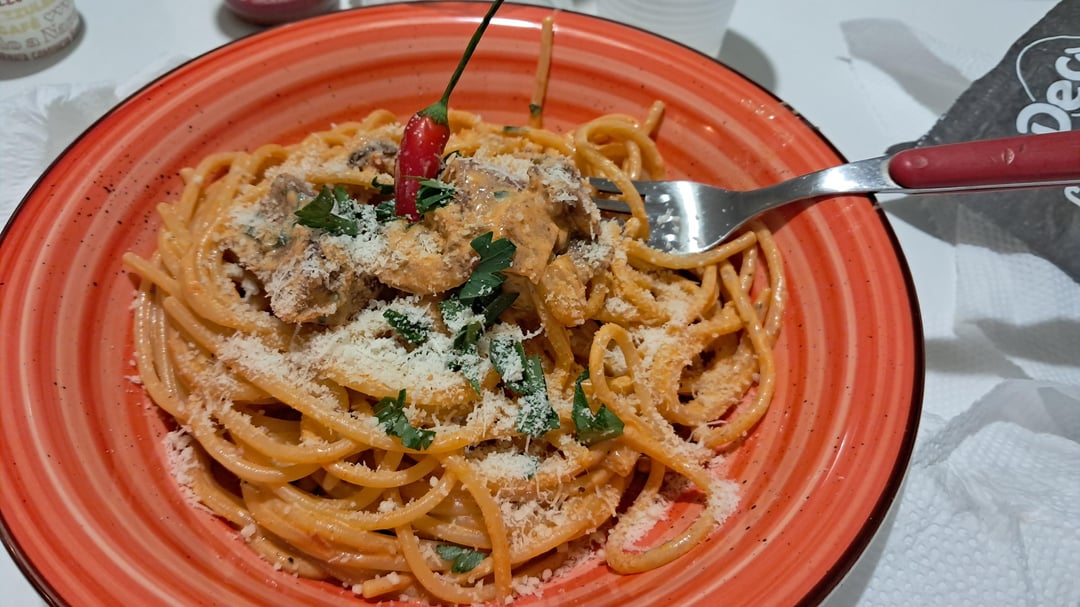 There is also olive oil, onions, a bit of tomato sauce, black pepper, garlic and parsley. The gochujang (one big spoon for 350 g of pasta) paste gives a so called "umami" taste that is so good and unique! Sprinkle a generous amount of grated Grana Padano or Parmigiano Reggiano cheese. Tagliatelle pasta could definitely be used instead of Spaghetti.