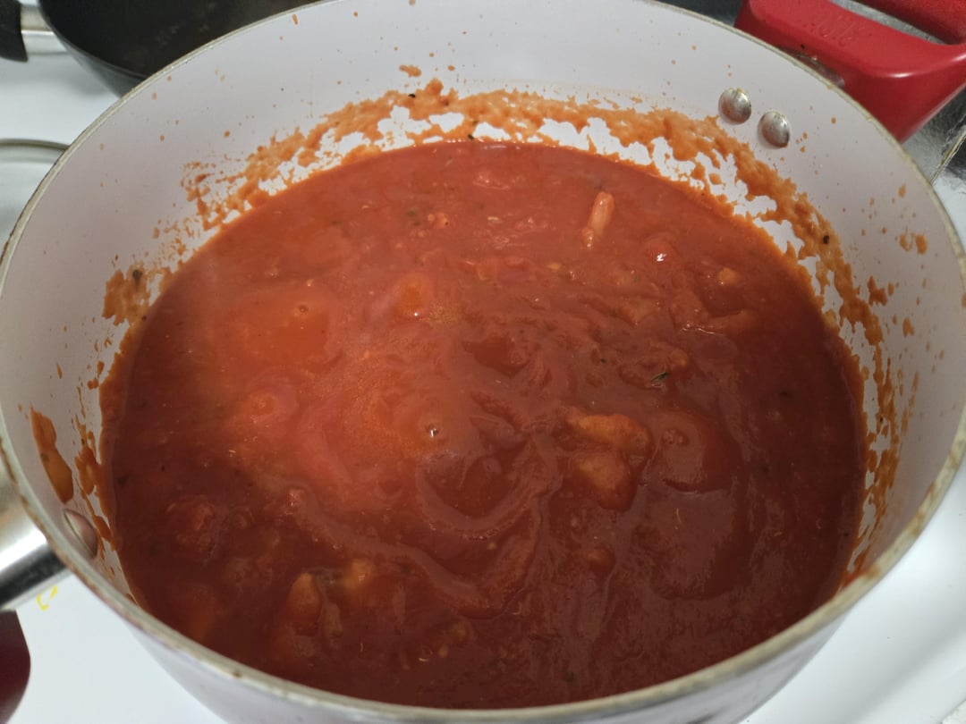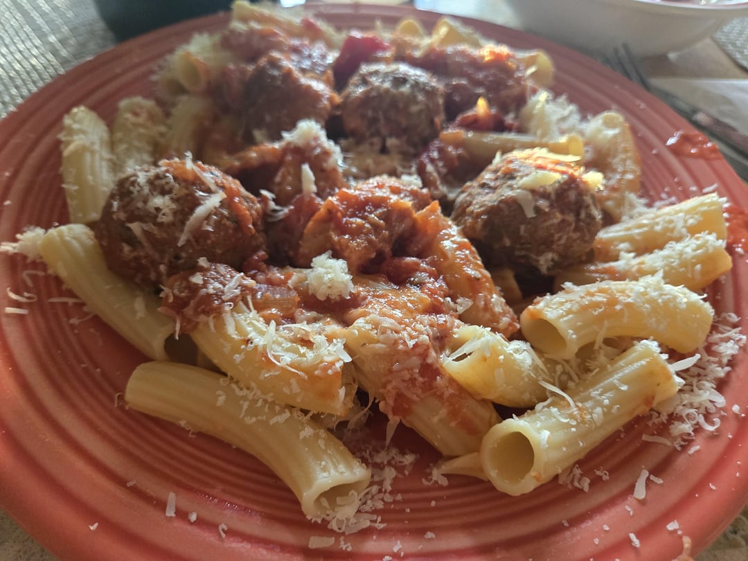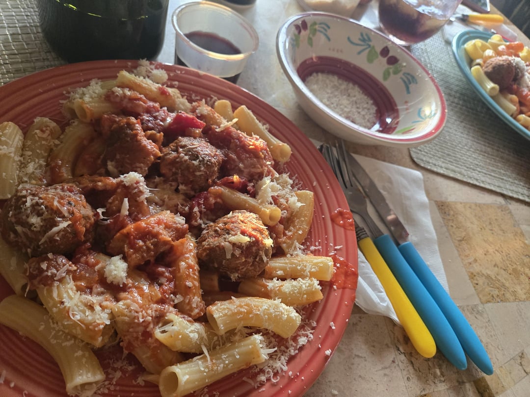 My GF made me rigatoni with a nice sauce that contained fried meatballs and fried breaded pork cutlets topped w extra parmegianno cheese