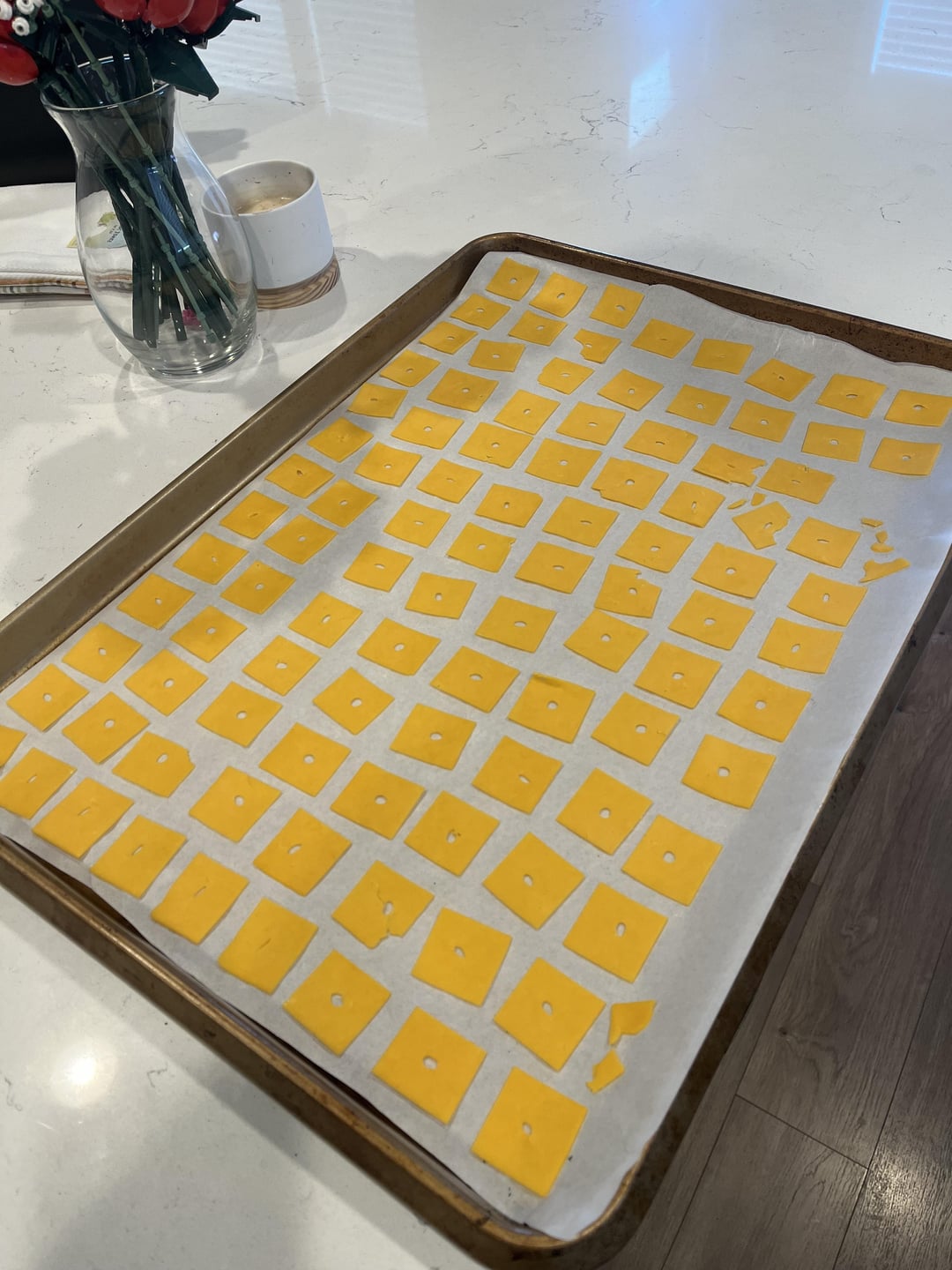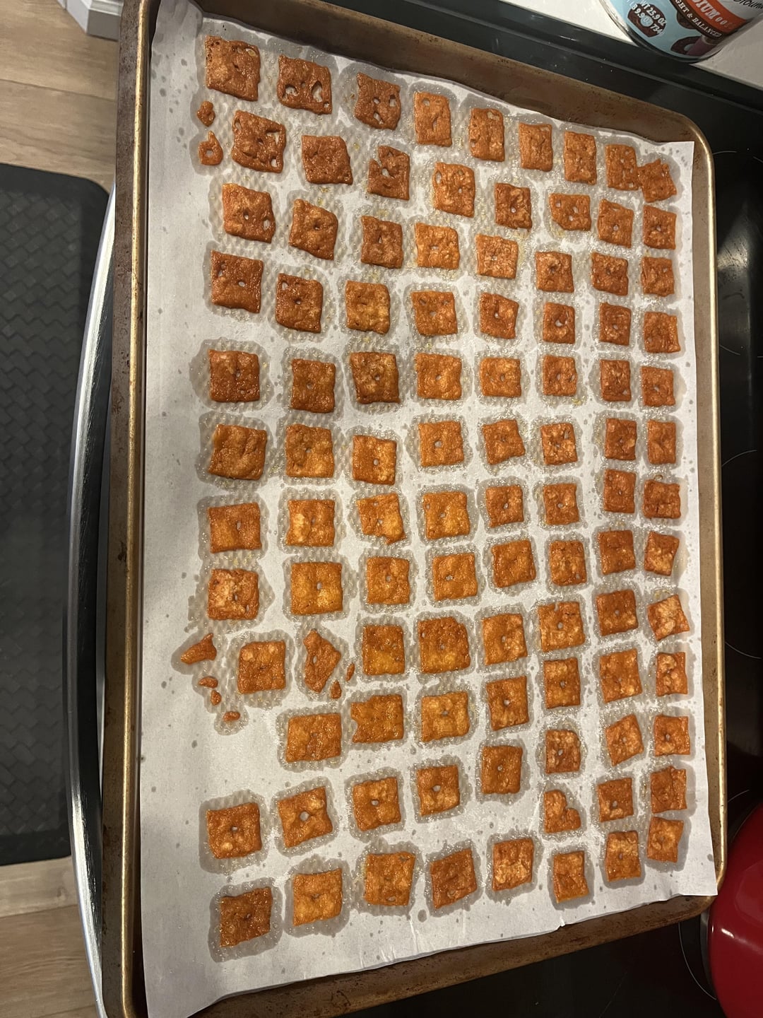 I have a new hyper fixation keto snack and wanted to share with you all because they are sooo good and taste almost exactly the same as the real thing. These are seriously good and super easy to make. I buy the ultra thin cheddar cheese slices. Cut them into nine squares. Use a plastic straw to make holes in them. Lightly salt. Bake at 275 for 25 min on parchment paper. And that’s it! I can’t even tell you how many batches of these I’ve made and will continue to make. So good.