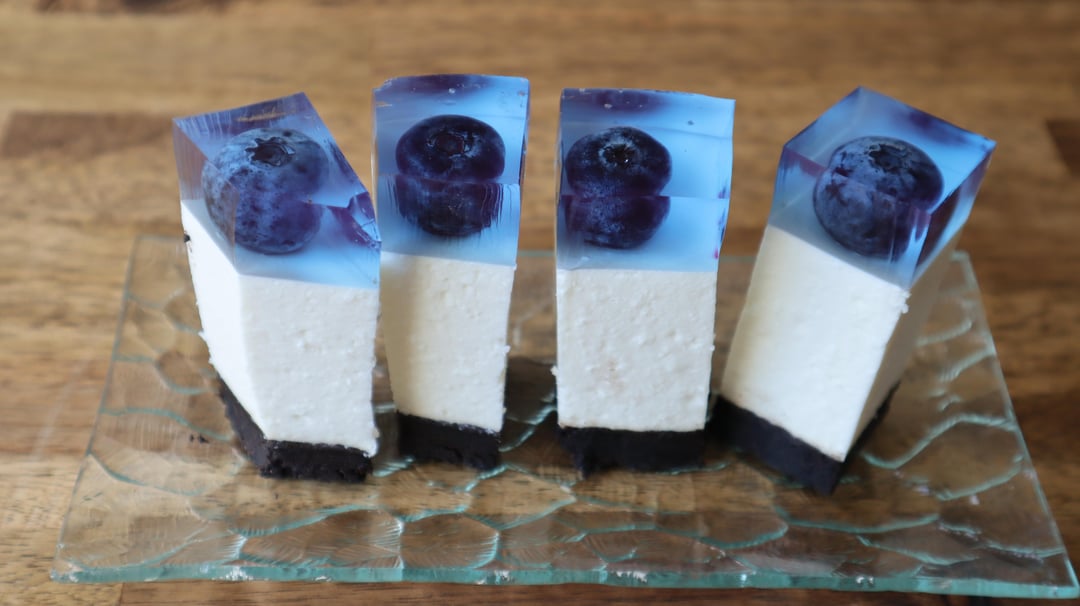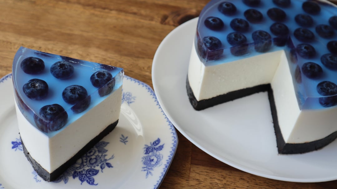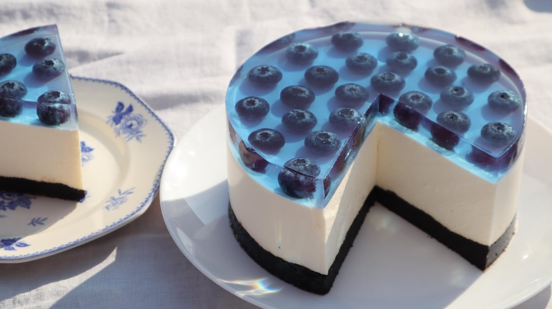 This looks absolutely stunning! That blue jelly layer with the whole blueberries suspended in it creates such a professional finish. The clean layers and that perfect slice are really impressive for a no-bake version.