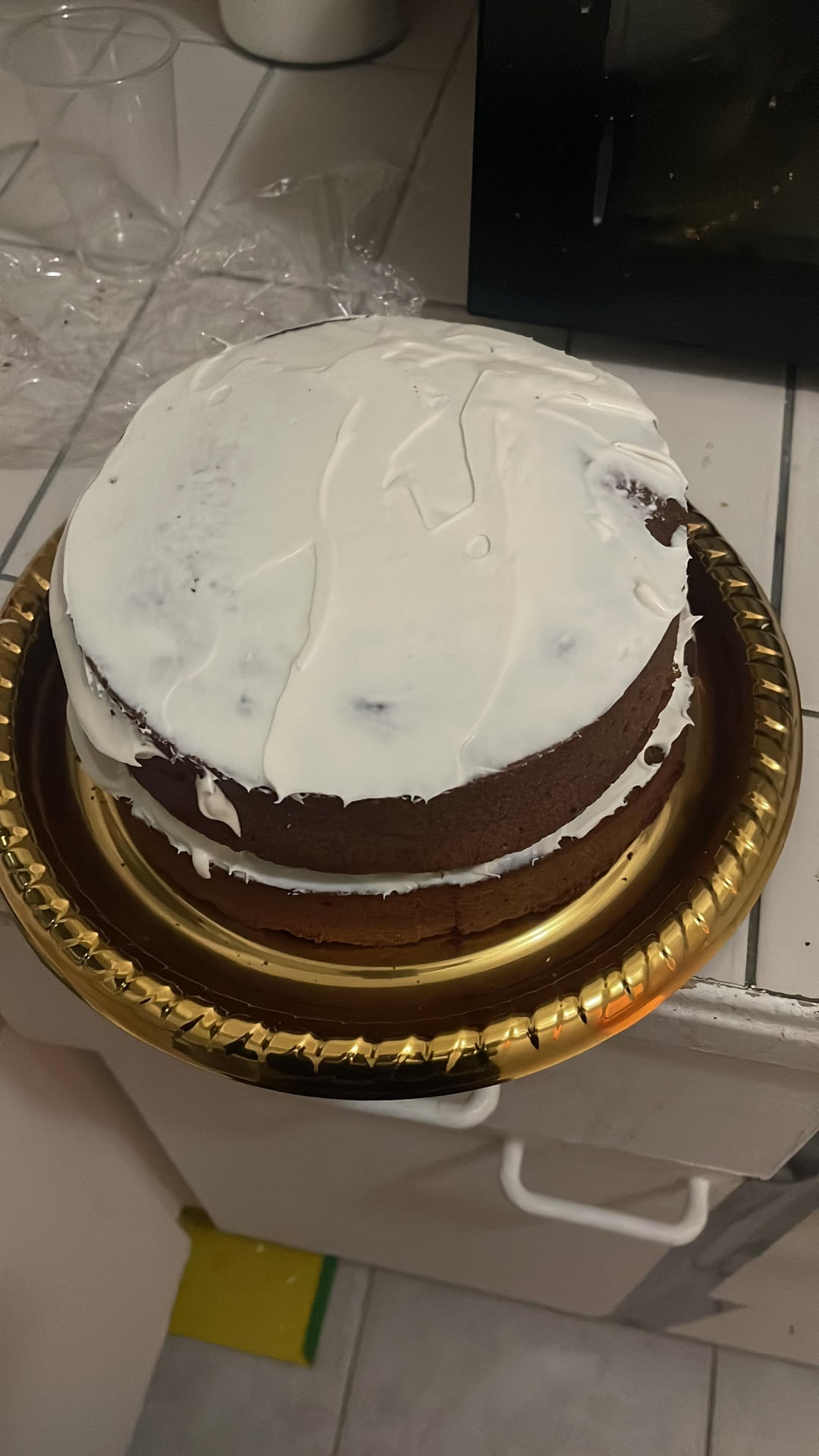 To make your life easier, have a cake turntable. Next, you wanna put a thin layer of frosting (crumb coat). This will help to minimize crumbs when you put on the final coat.