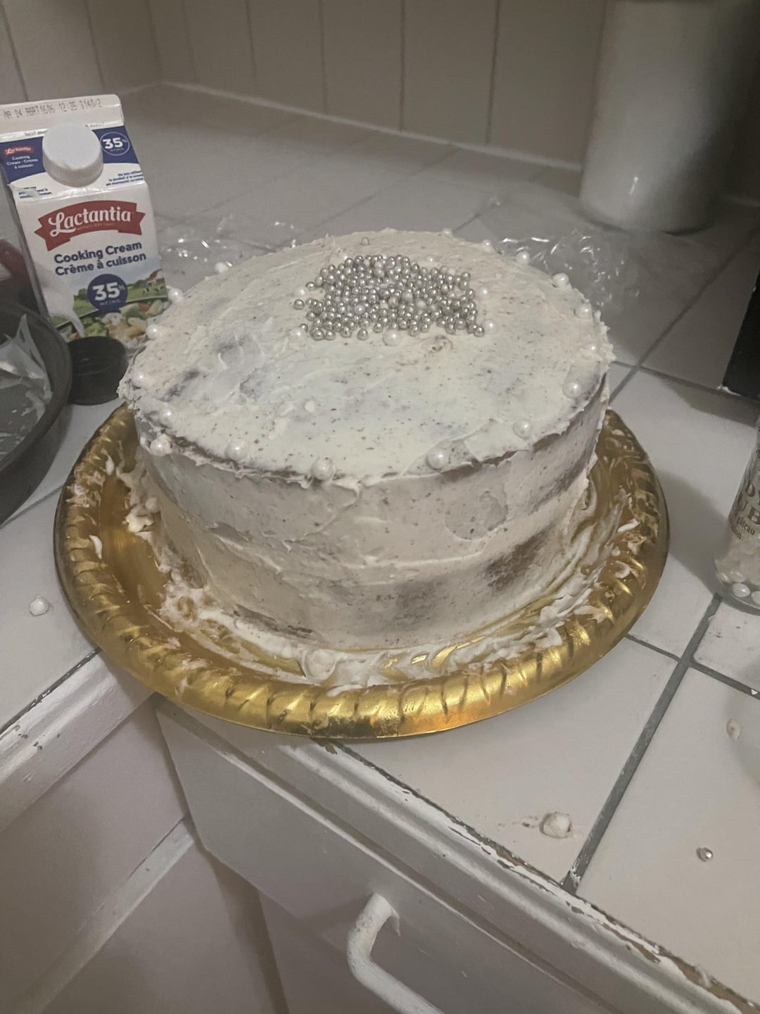 It looks kind of rushed on top of not having enough icing or having a cake stand (but that couldâve been fixed by just wiping the plateâs edge). Look up how to do a crumb coat like someone else suggested and like, quadruple your icing. And personally Iâd ease up on the amount of edible pearls because that many of those lil fuckers hurt to chomp down on all at once. Other than that, the cake itself looks great! Doesnât look like it stuck to the sides of the pans at all which is good. You could definitely salvage this cake too if you took off the pearls and did the above (and add the pearls back later).Â