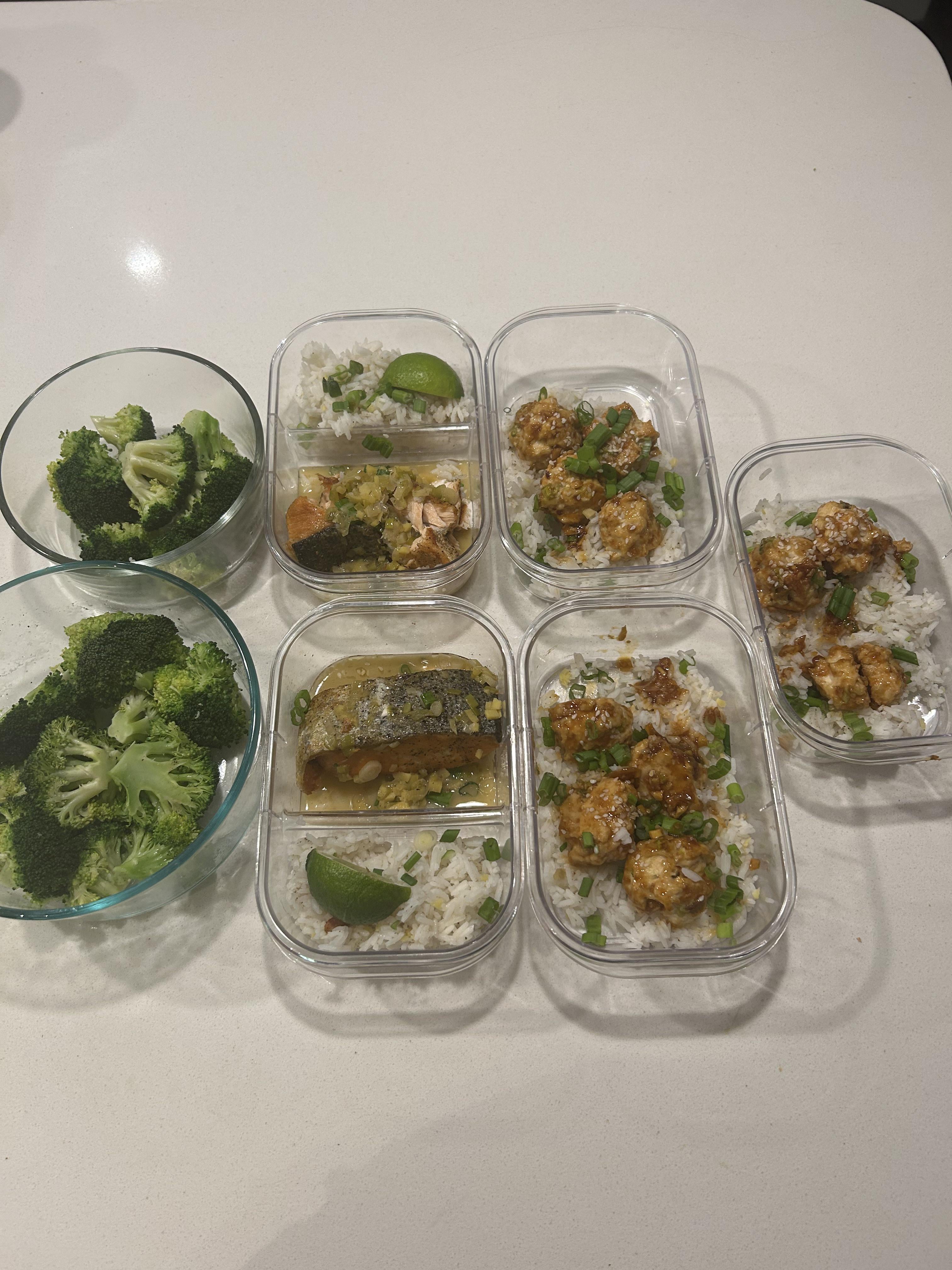 Husband is getting lunches on left: – ginger lime salmon – ginger rice – steamed broccoli My meals are on the right: – Asian chicken meatballs – ginger rice by MinimumHealthy 3 Comments MinimumHealthy 7 months ago [ginger lime salmon](https://www.hellofresh.com/recipes/ginger-lime-salmon-5e25ffd36f92761f752a1e67) (made my own dupe of hello fresh recipe) MinimumHealthy 7 months ago [Asian chicken meatballs](https://www.skinnytaste.com/asian-chicken-meatballs/) Hotline_Pizza_Miami 7 months ago Love the glassware! Looks tasty!! Thanks!Write A CommentYou must be logged in to post a comment.