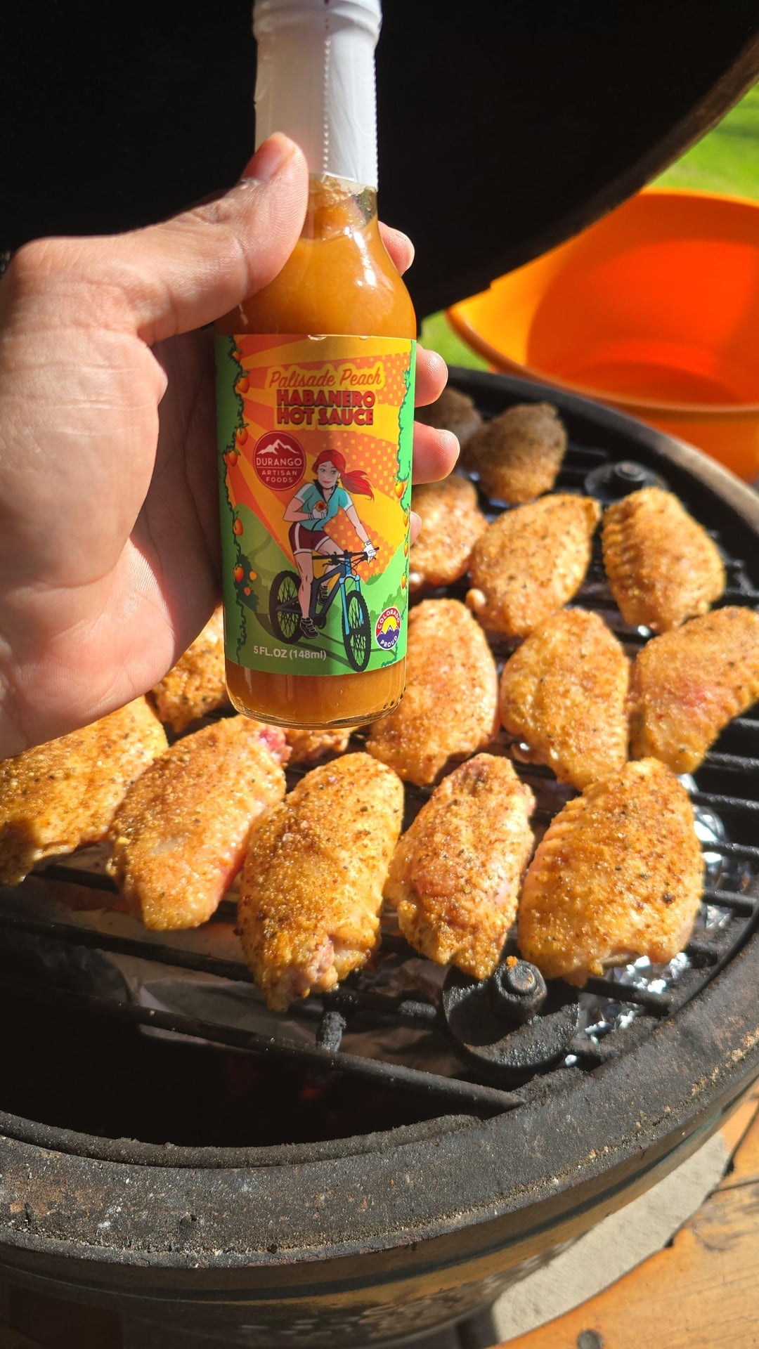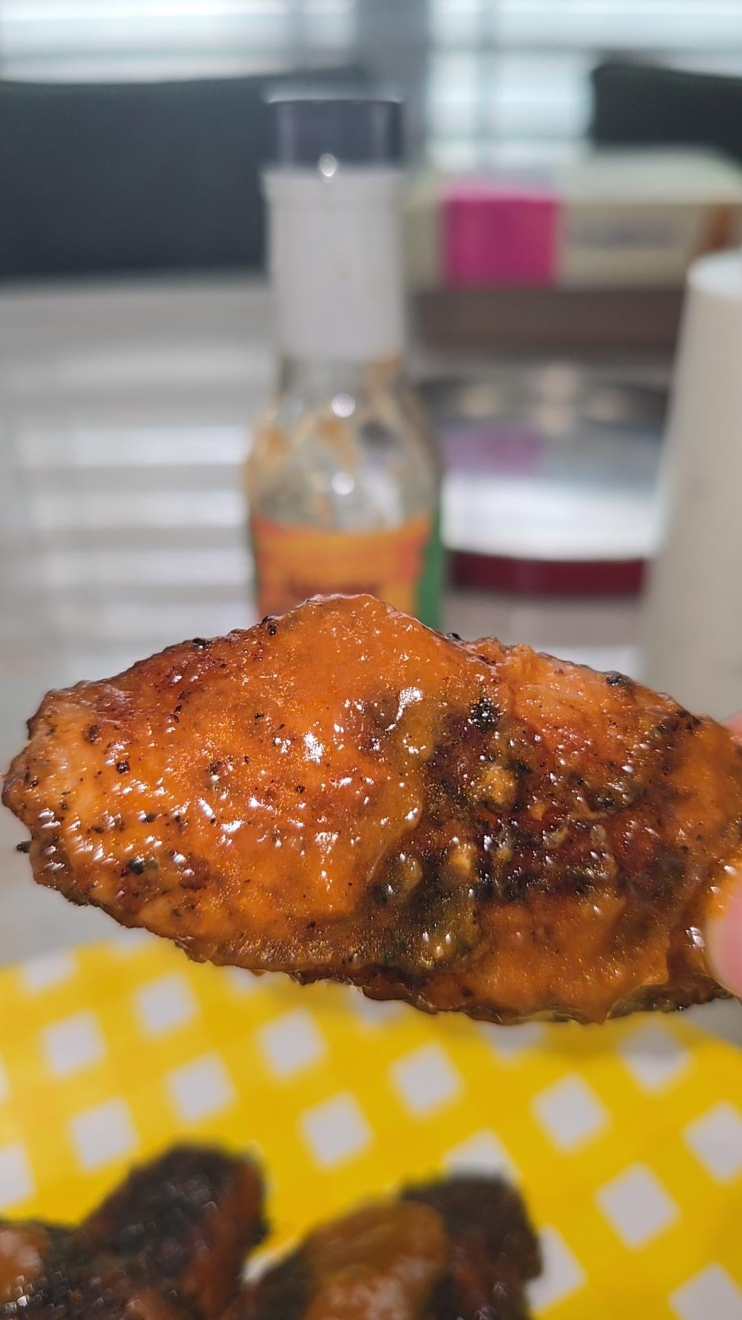 The sauce was a mix of butter, 1/3 cup franks, and 2/3 cups Palisade peach habanero hot sauce