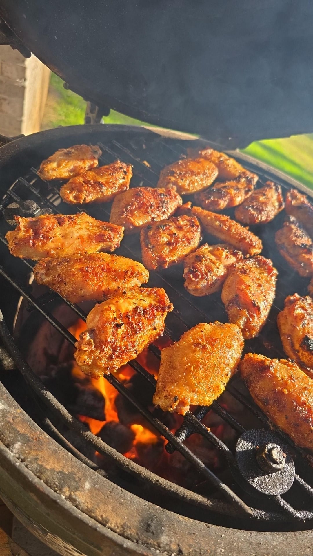Fired up the grill to about 320 and set up for indirectly cooking. put the wings down and turned them about 40 minutes in. took the wings off, tossed them in sauce and put them back on the egg over direct heat for about 5 minutes.