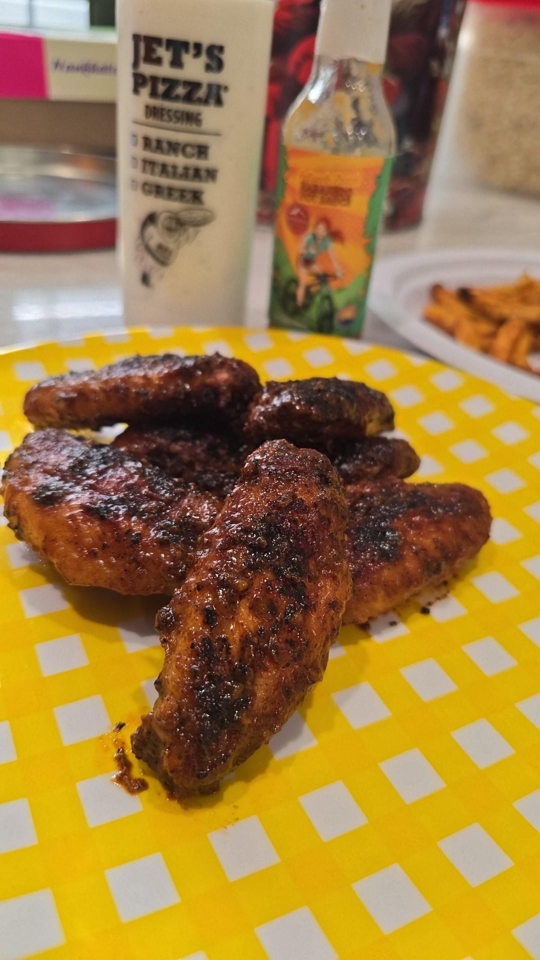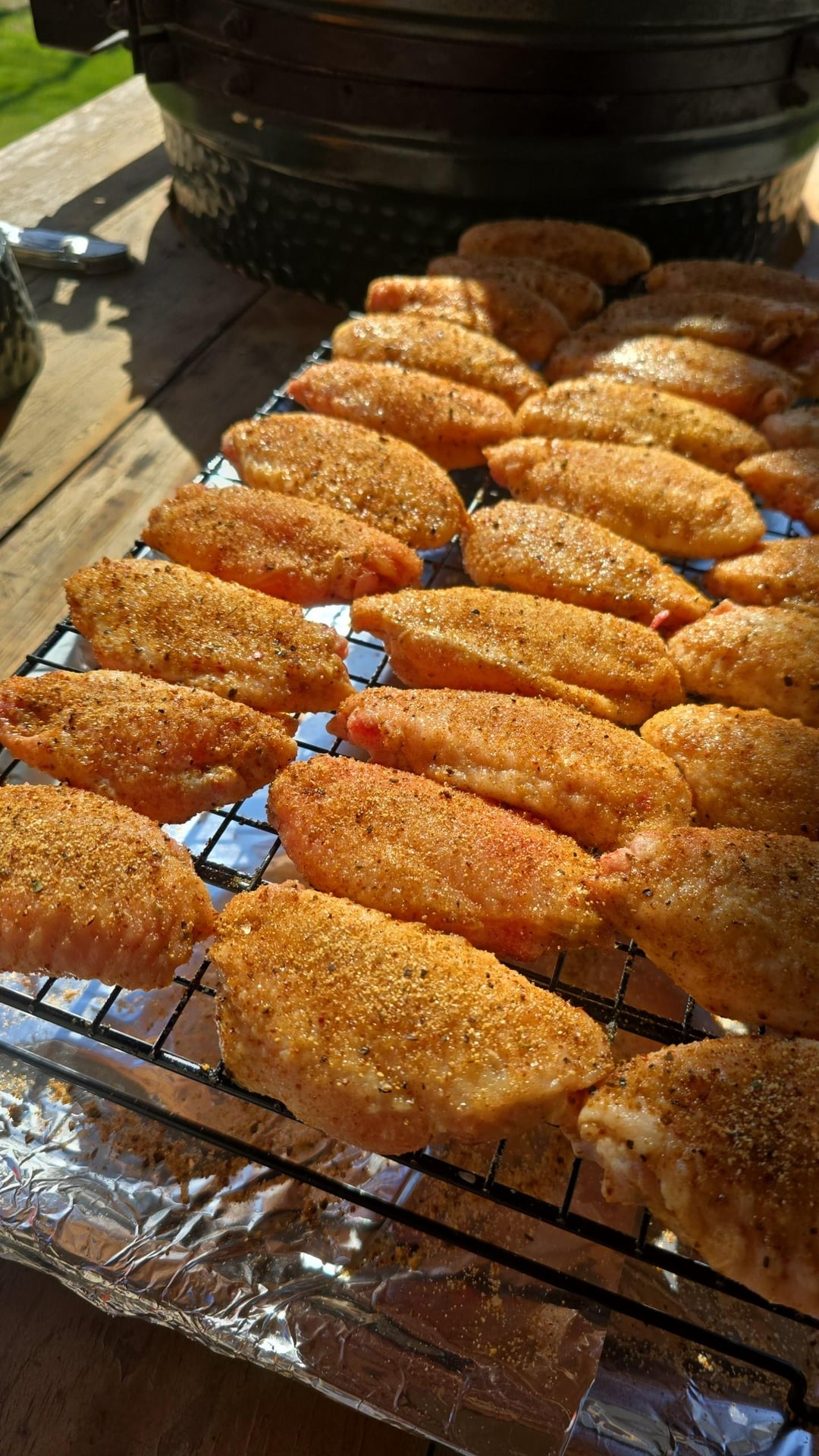 Coated the wings in salt and baking powder over night. an hour before grilling I Tossed them oil and dusted with garlic powder, holy voodoo, and 5 pepper/salt seasoning.