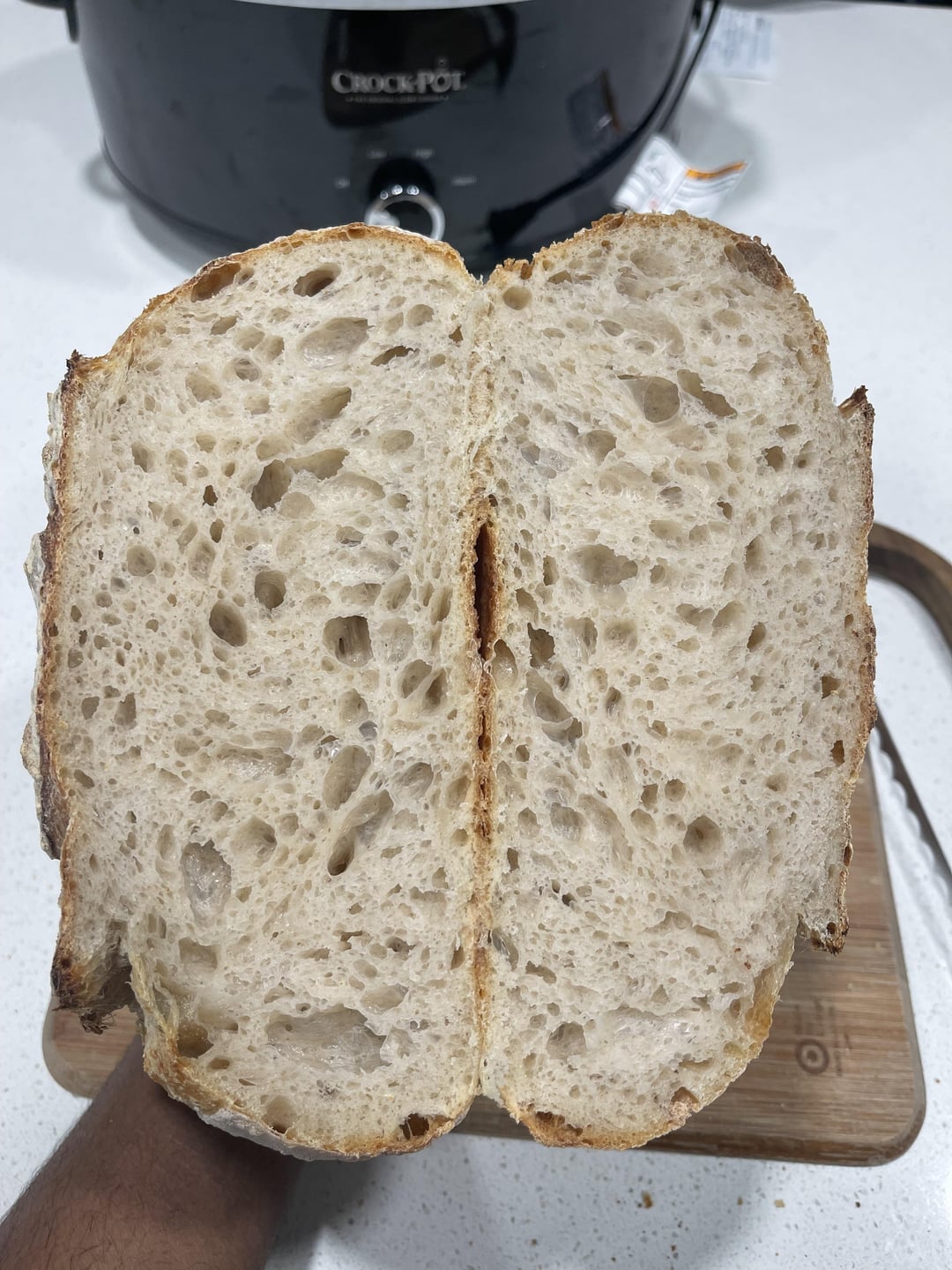 Mixed dough, let rest for 1hr. 4 of stretch and folds, bulk fermented for about 4 additional hours. Cold proofed for 20hrs, then baked at 500F for 20min lid on, and then 450F for 20min lid off. Waited 12hrs before cutting 😅