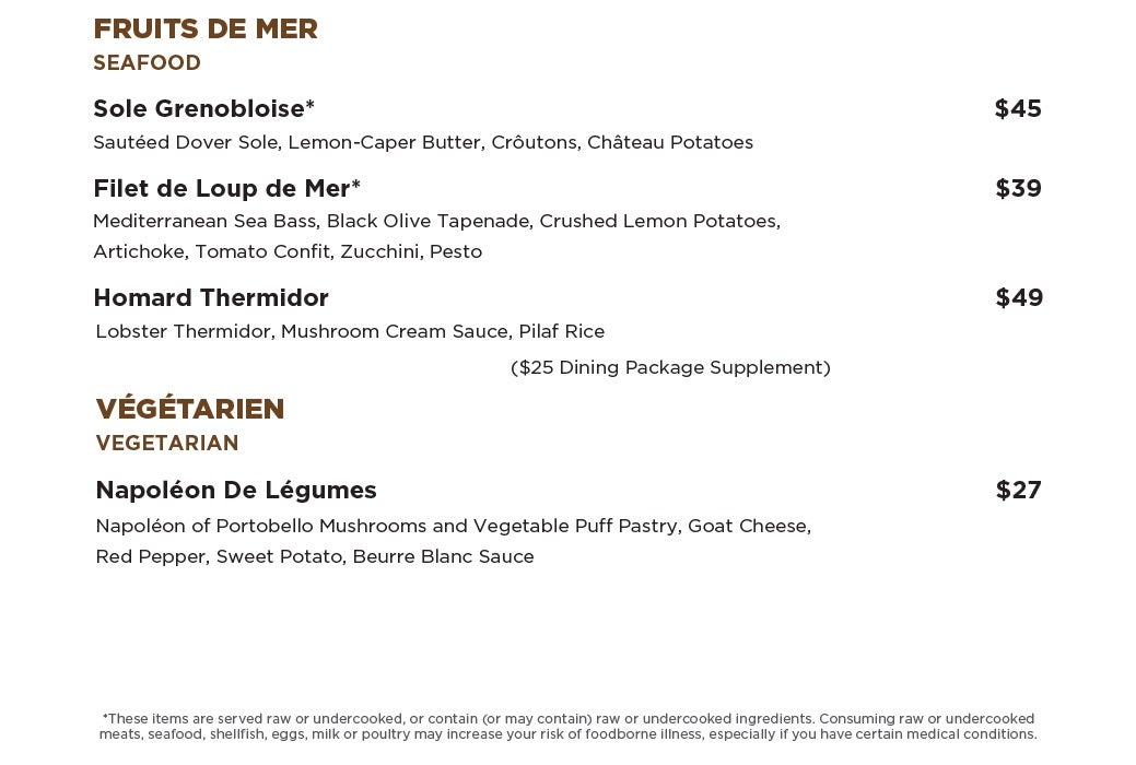Mains — divided into meats, poultry and seafood — might feature beef tenderloin, roasted lamb and pork chops, red wine-braised chicken, roasted duck breast, Dover sole, Mediterranean sea bass and lobster thermidor. A vegetarian section includes one measly offering: Napoleon of portobello mushrooms with a vegetable puff pastry.