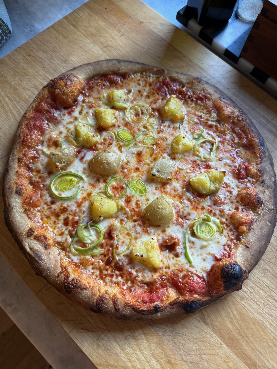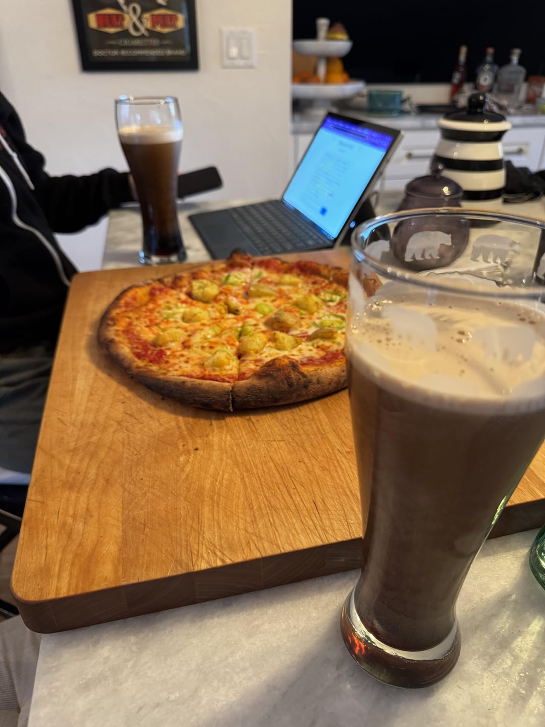 I was inspired by the 10,000 dollar pizza post on this sub to try making a dough with Guinness! Only let this guy mature for 18 hours before cooking him and was surprised at how good the flavor was.