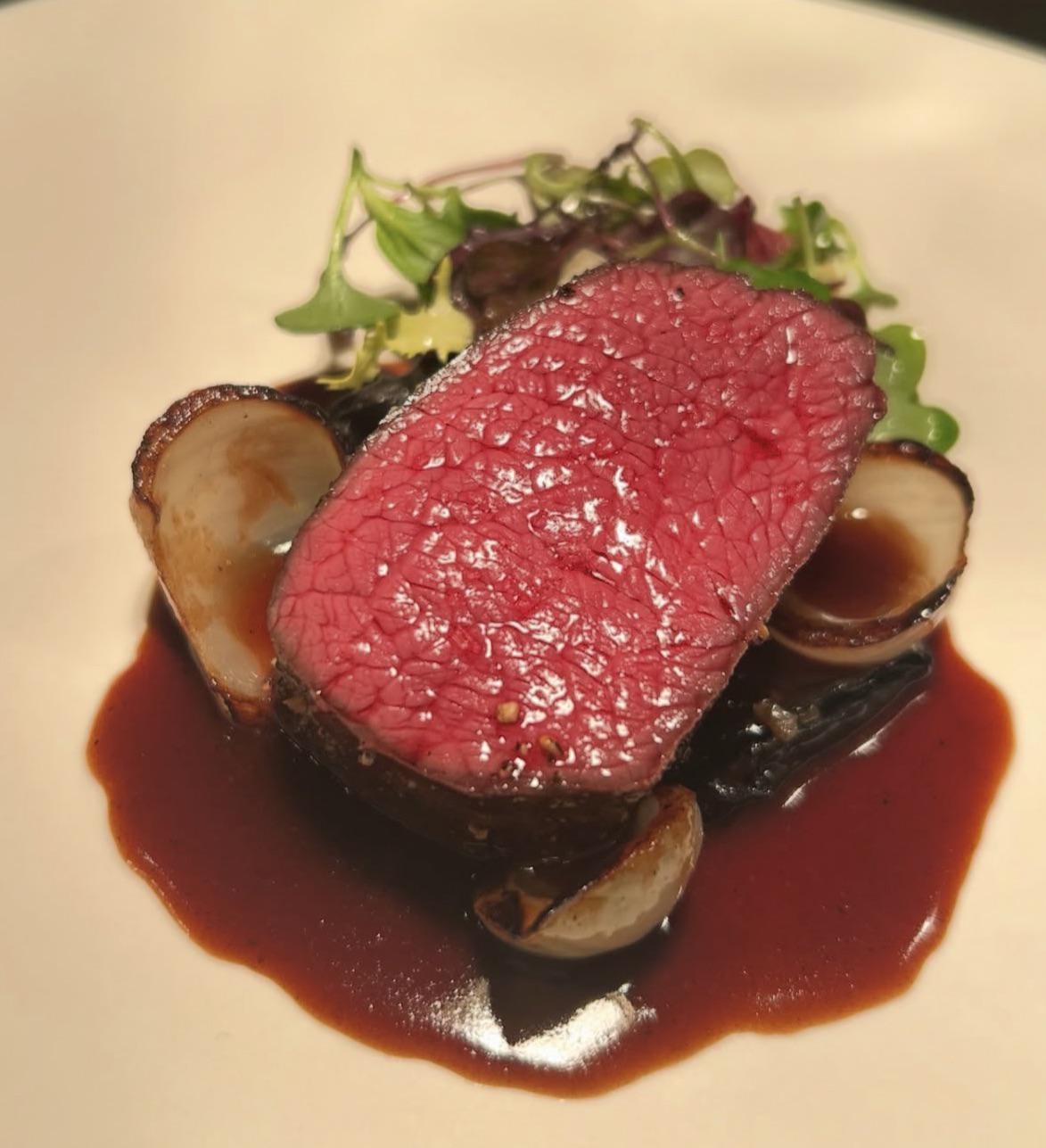 Looks great. Too rare for me personally, but still know a beautiful piece of steak when I see one, and would still love to be served this. As an aside, what’s that beneath it? Are those mushrooms? The piece on the left looks like a slice of a small potato, piece on the right looks more like a cup since it has the sauce pooled in it.