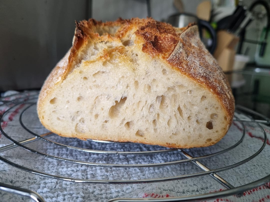 My first loaf was okay, but the next few have all been dense and pancake-y. I finally let one dough bulk rise for 12 hours asuming it will overferment (it's 20°C at home), but i guess it got perfectly proofed instead. I was also finally able to shape it better. It has been a long one-month journey of trial and error, with more error than anything else, but I finally feel like I'm getting the hang of it.