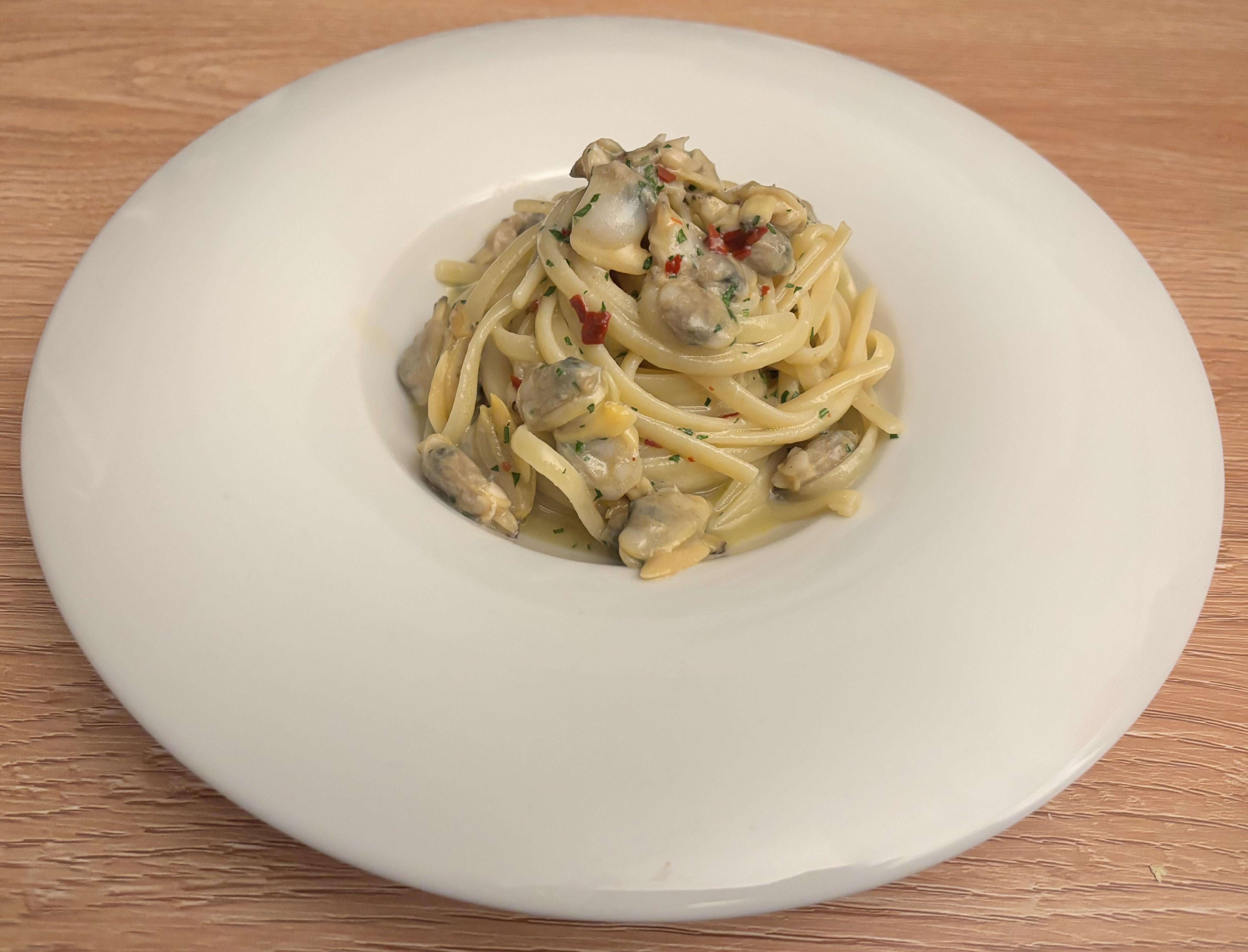 – beautiful plating and plate choice – great sauce coverage and coagulation – perfect ratio of clams to noodle