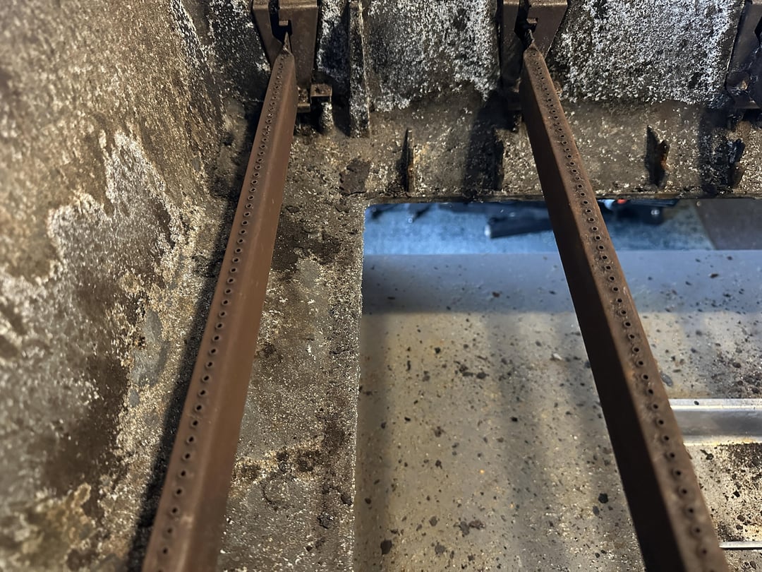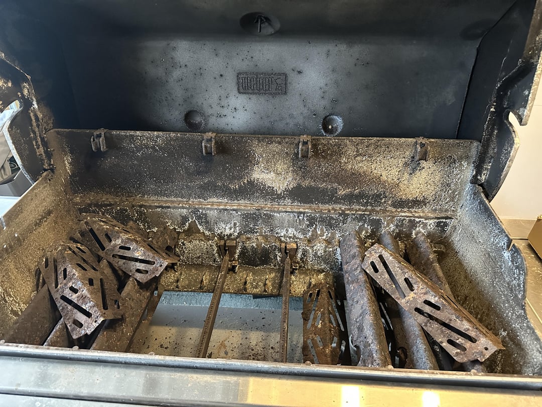 Pulled this from the neighbors shed, mine for keeps if I can make it functional. First off I did order new grates, flavorizer bars as well as deflectors. I will also be fixing the ignition system soon. My big question is on the correct or cost effective way to clean the body and check the health of the burners. The lower body in the center seems to sag not sure how maybe heat but I doubt it. It blocks the drip pan from seating correctly.