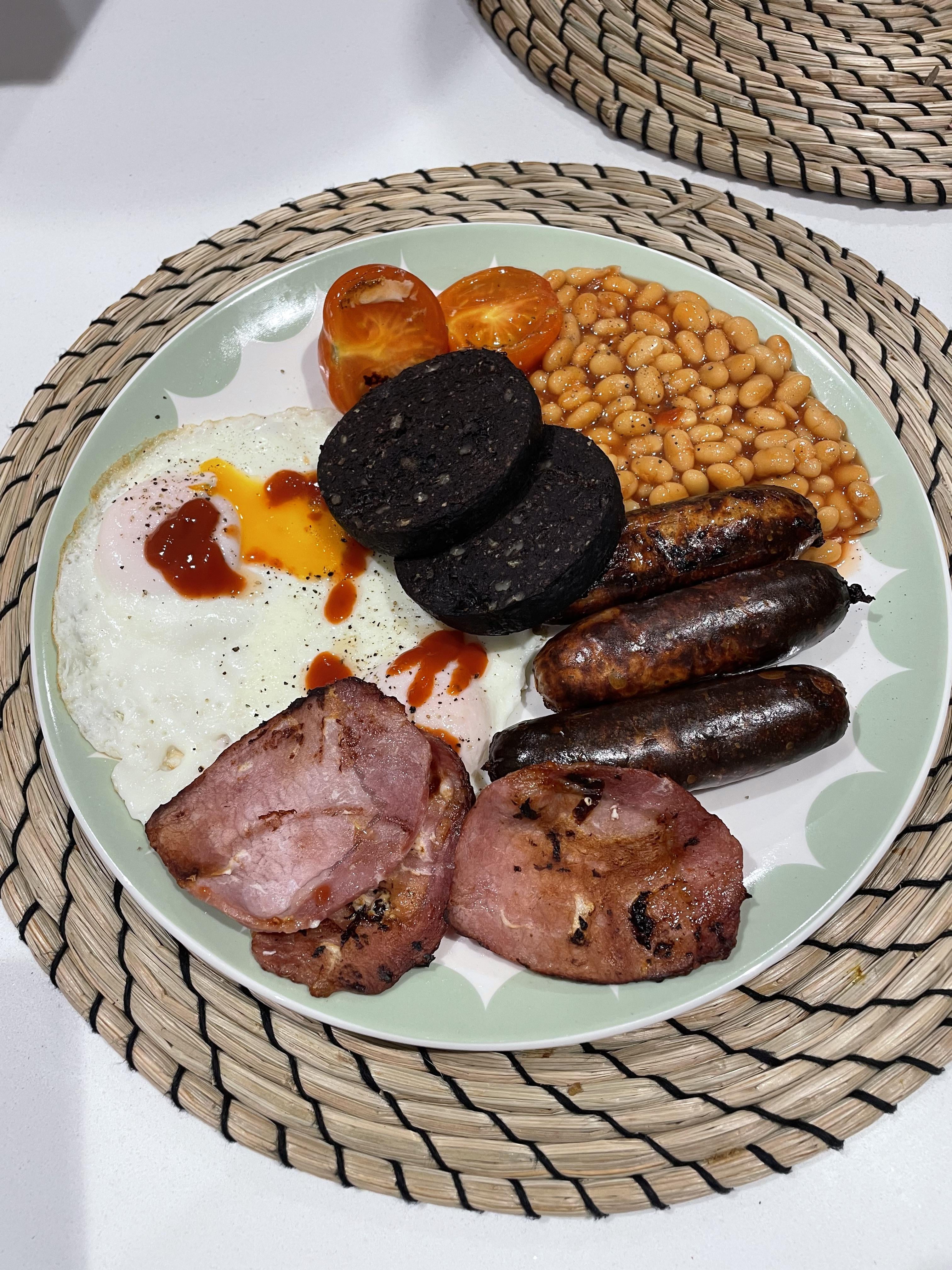 Low fat sausages, bacon medallions and semi poached eggs (fried in fry light and finished with a ladle of water with lid on). by stevielfc76 Write A CommentYou must be logged in to post a comment.