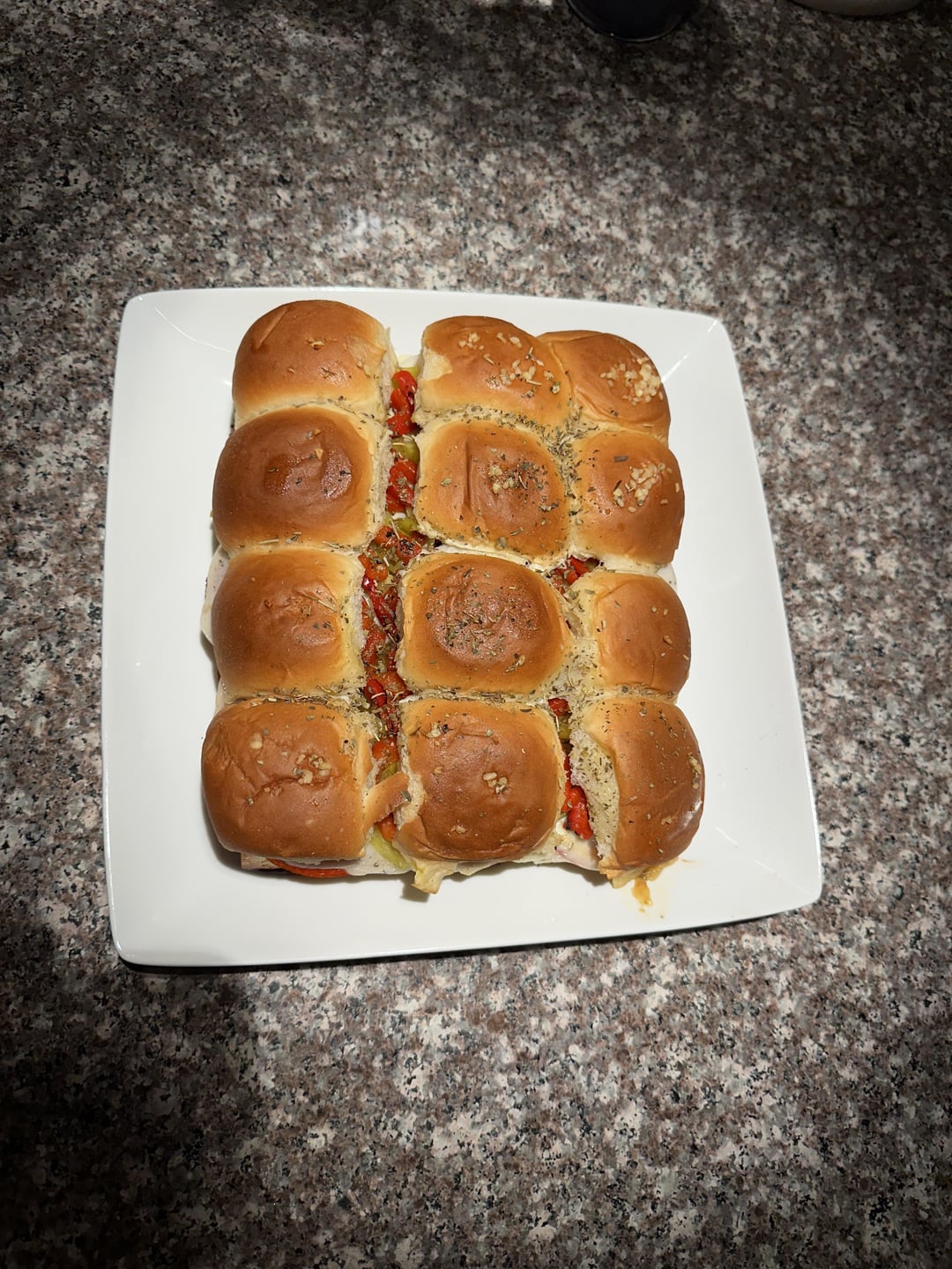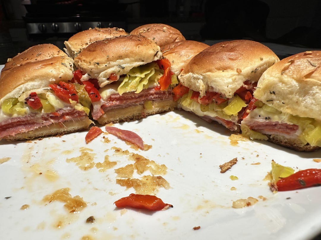 Recipe is: Hawaiian rolls, 1/4lb of ham, 2 layers of salami, 2 layers of pepperoni, Provolone, Pepperoncini (chopped from a jar), Roasted red peppers (from a jar), Squirt of sub oil