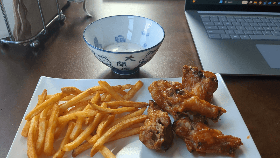 Air fried and tossed in Frank's red hot with a little bit of Valentina hot sauce mixed in. Tossed the fries in the left over sauce as well to give them a kick as well.