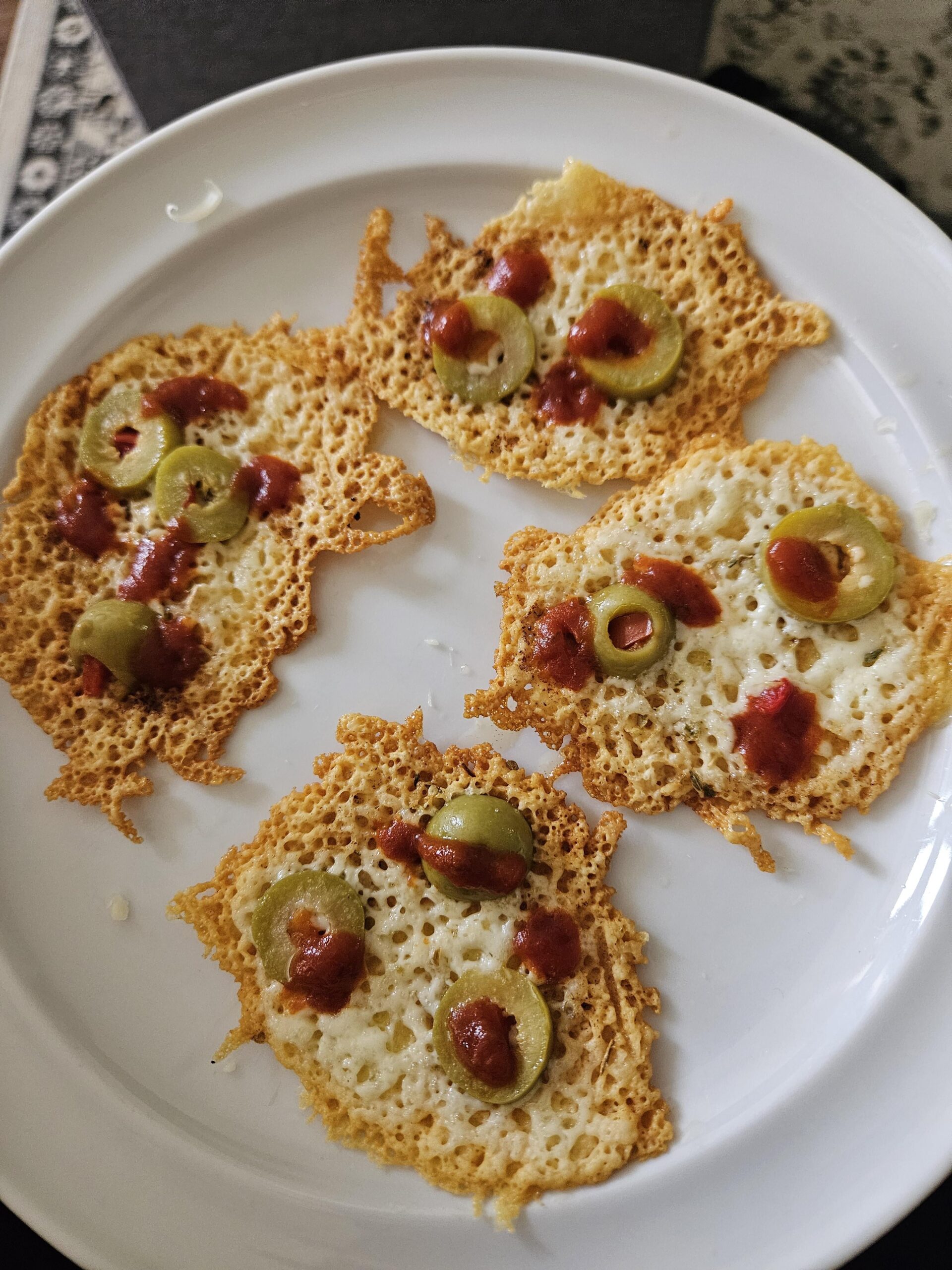 Put frying pan on medium heat, add little piles of mozzarella cheese. Once they start to brown on sides, add the olive and a little dollap of marinara plus a sprinkle of oregano.