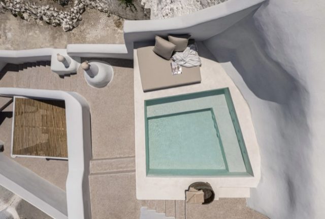 Nestled into a steep hillside in the village of Mesaria on the edge of Santorini’s caldera are the fruits of a new project by local design studio Kapsimalis.