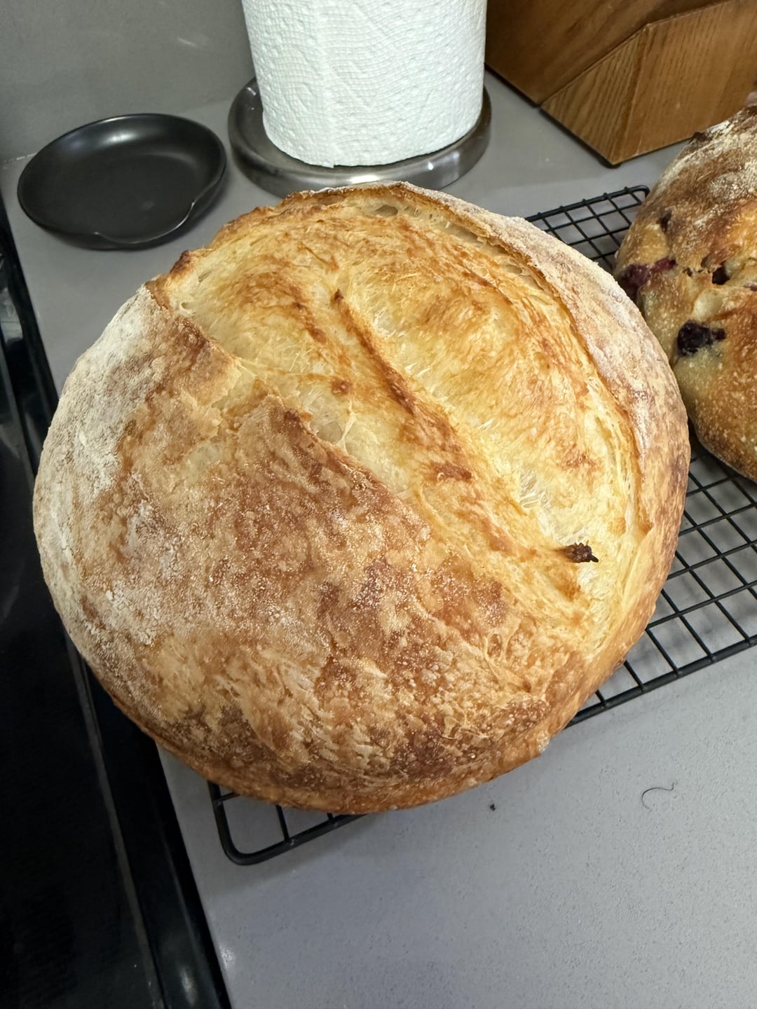 Preheat oven to 450° with bread oven/DO in it. Once oven reaches temp, remove dough from fridge. It has hopefully continued to proof some in the fridge. Place dough on silicone bread sling or parchment paper. Remove BO/DO from oven. Place bread in BO/DO, cover and place in oven for 6 mins. Remove from oven after the 6 mins to score, recover and place back in oven for 23 mins. Remove lid, lower oven temp to 425° and let bread bake uncovered for 15 mins or to desired color. Remove from oven and place loaf on a wire rack to cool. There will be some melted butter drippings so have something to catch it under your wire rack!