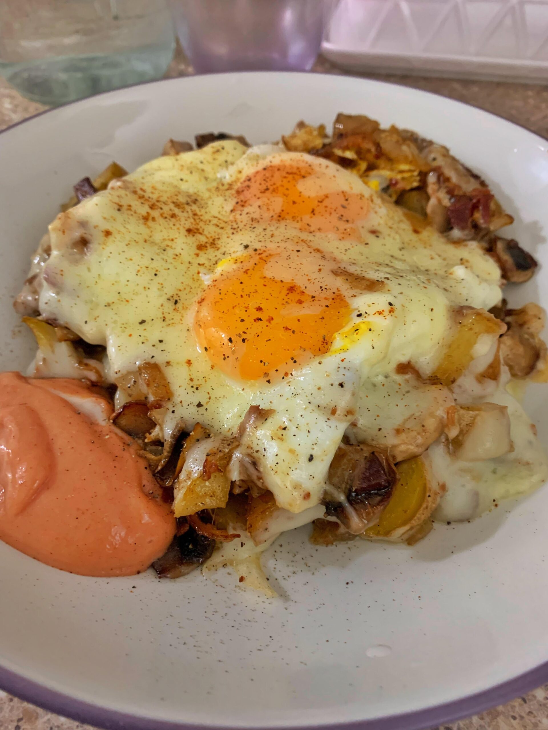 Hashed leftover garlic roasted fingerling potatoes, onion, mushrooms, and crumbled bacon, fried in creamery butter. Cracked two eggs into a well in the middle, threw on some fresh shredded Havarti, and popped a lid on it. 🍳 by CharlotteLucasOP 1 Comment fizztothegig 11 months ago what sauce is that on the sideWrite A CommentYou must be logged in to post a comment.