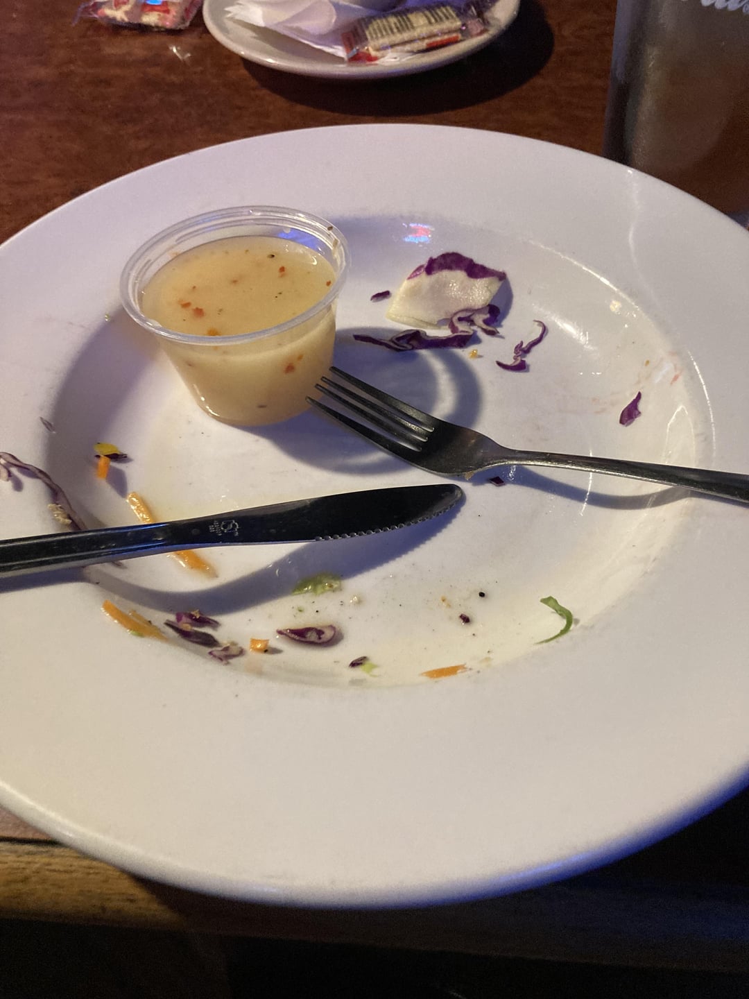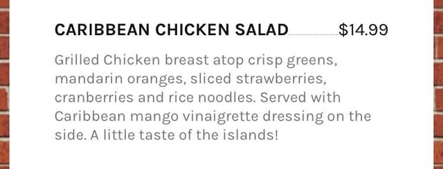 I went out to dinner and was hoping to not wreck my calories. There’s no cheese in the salad – the full description from the menu is in the photos. I also only used a bit of the dressing for dipping the chicken.