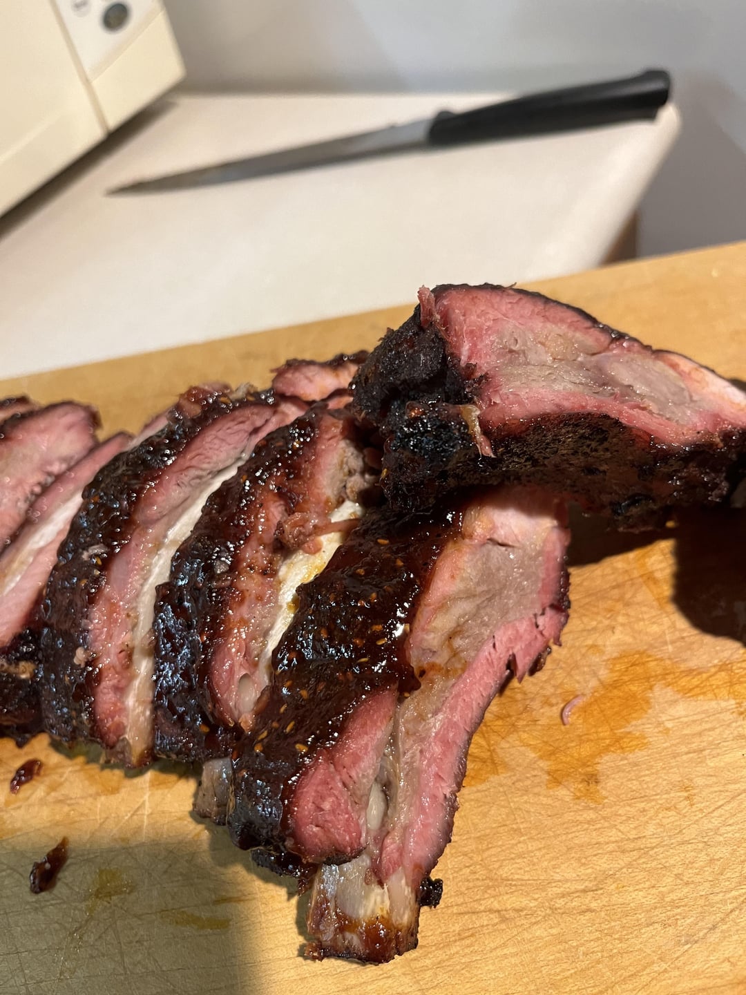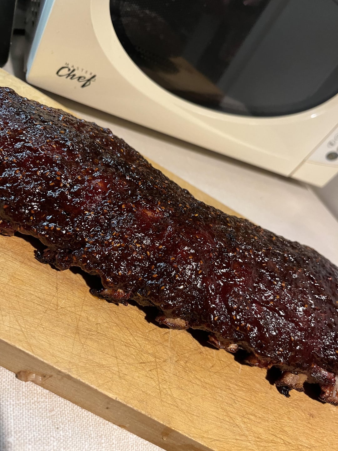 Pork ribs rubbed in a sweet and smoky coffee rub, smoked over Kingsford OG and maple wood on the Weber Kettle and glazed with a raspberry, maple and soy glaze.