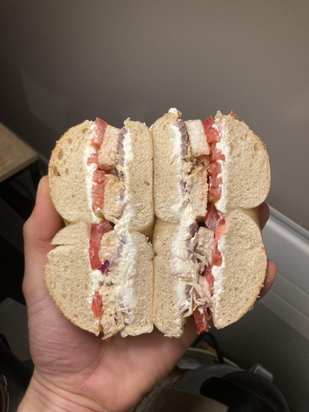 Made some simple sandwiches with plain cream cheese, roasted chicken breasts, tomatoes and red onions. A real treat !!