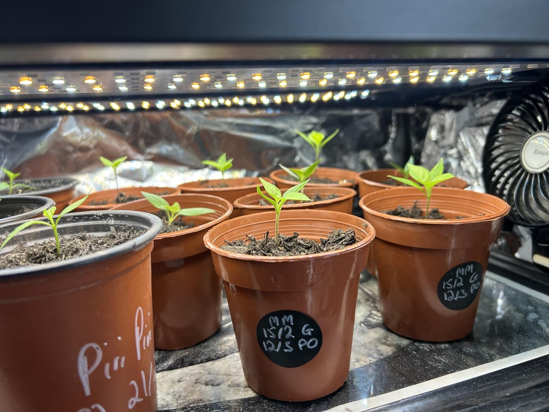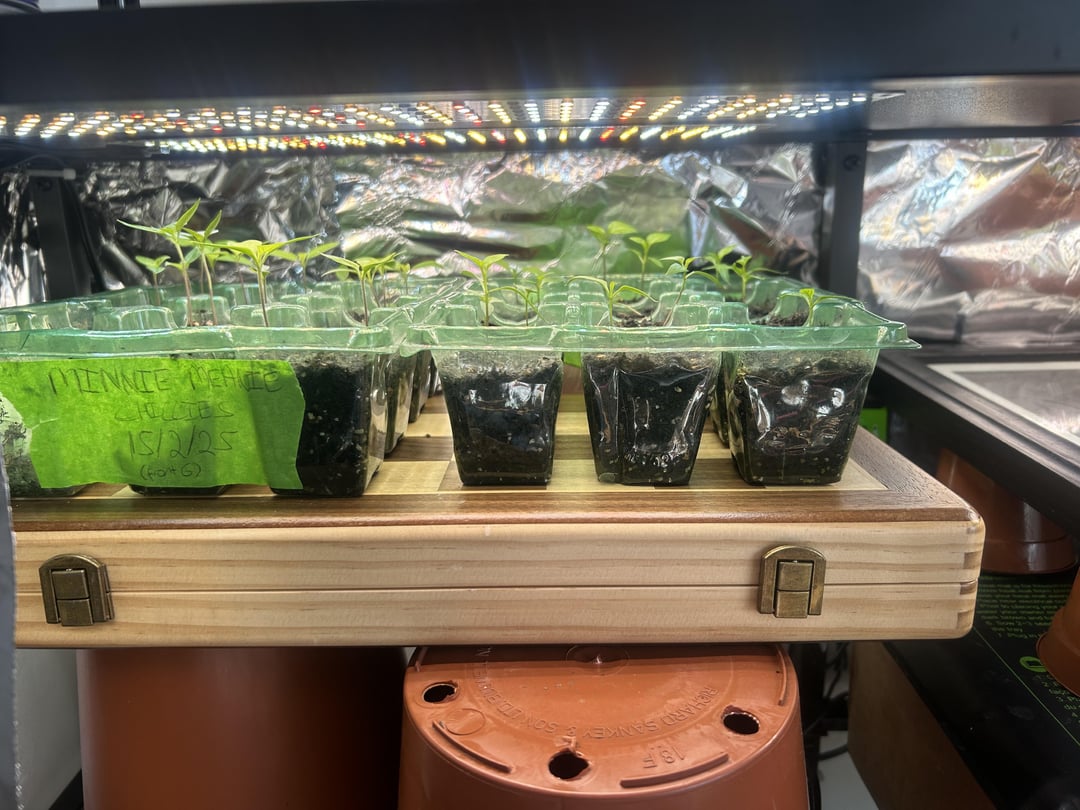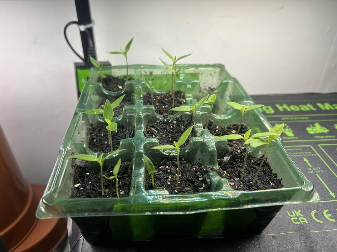 All but the Scotch Bonnets were sown 15 Feb in a heated propagator, and I’ve recently potted up to 3” pots (some today) after seeing true leaves. I buried the stems a little as they had been reaching for light. I used some seaweed fertilizer via the bottom watering around 5 days ago.