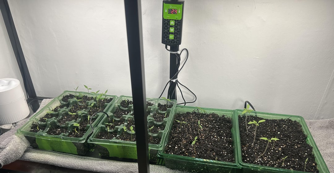 I took them off the heated mat after germination and recently stuck a small fan and some foil wrap around them to move air and disperse light.