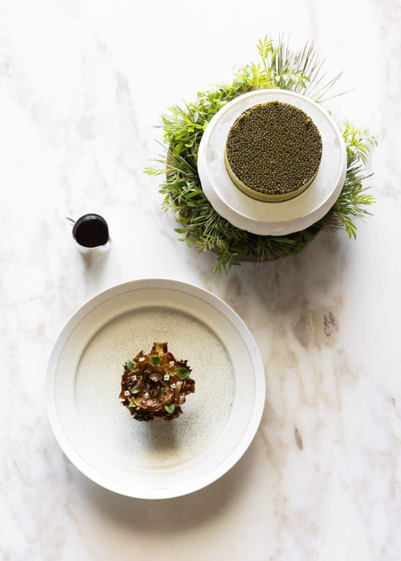 Scorsonère, cornouille, noix, garum, herbes amères, shoyu de champignons (c) Matteo Carassale