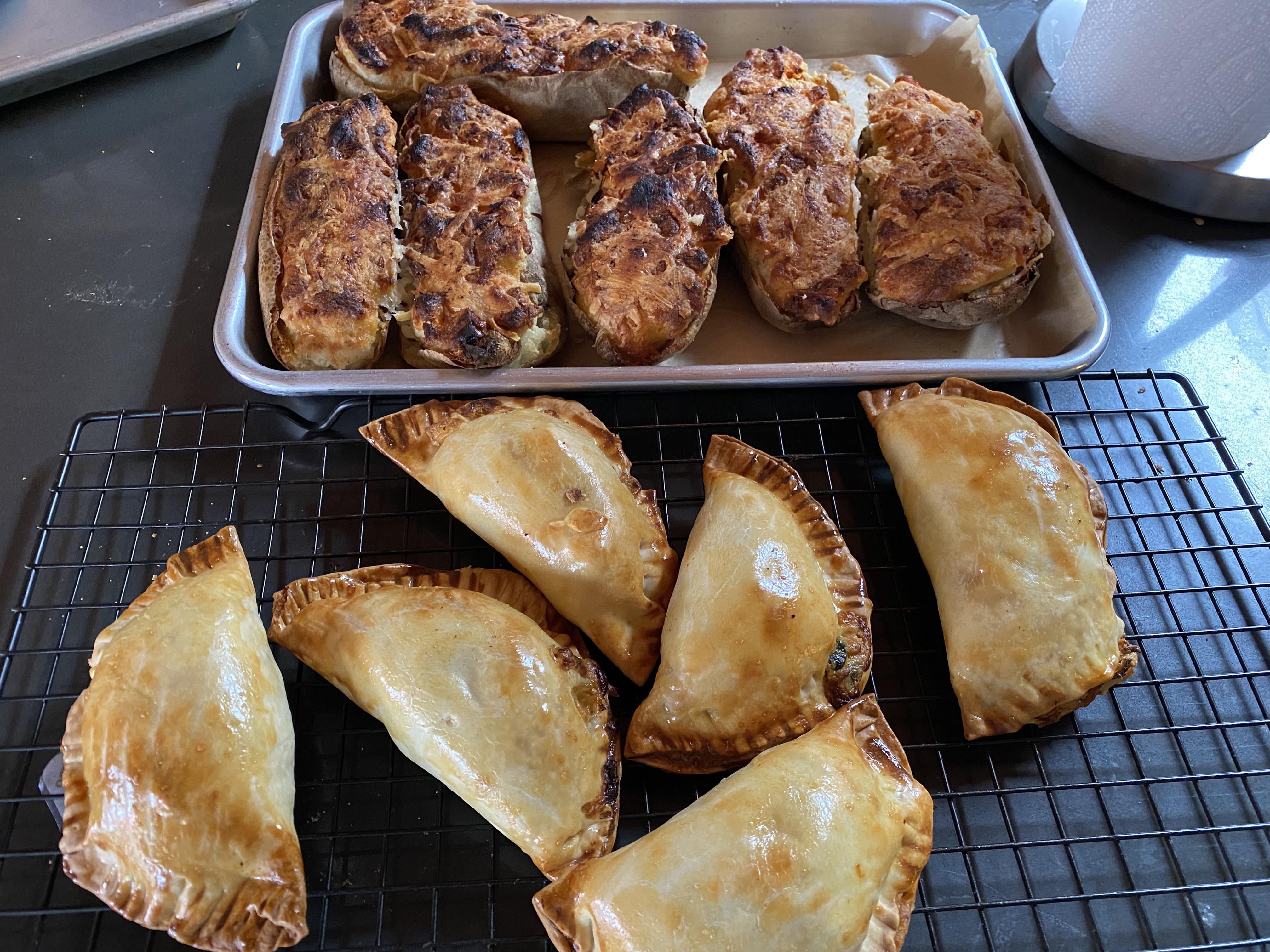 Used frozen empanada dough, already cut into rounds. Filling is chicken, cheese, green chiles, onions, garlic powder, cream cheese, sour cream, Mrs Dash chipotle seasoning. Potatoes are baked, cut in half. Mashed filling with cheese, chives, garlic powder, topped with cheese and paprika. Made 12 empanadas and 8 twice baked potatoes. Ate some for dinner and will freeze the rest. Had to use the air fryer, oven is on the blink.