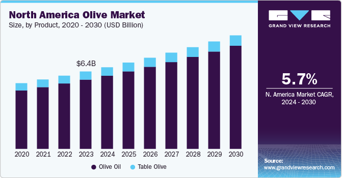 b. The North America olive market size was USD 6.35 billion in 2023 and is expected to reach USD 6.71 billion in 2024.