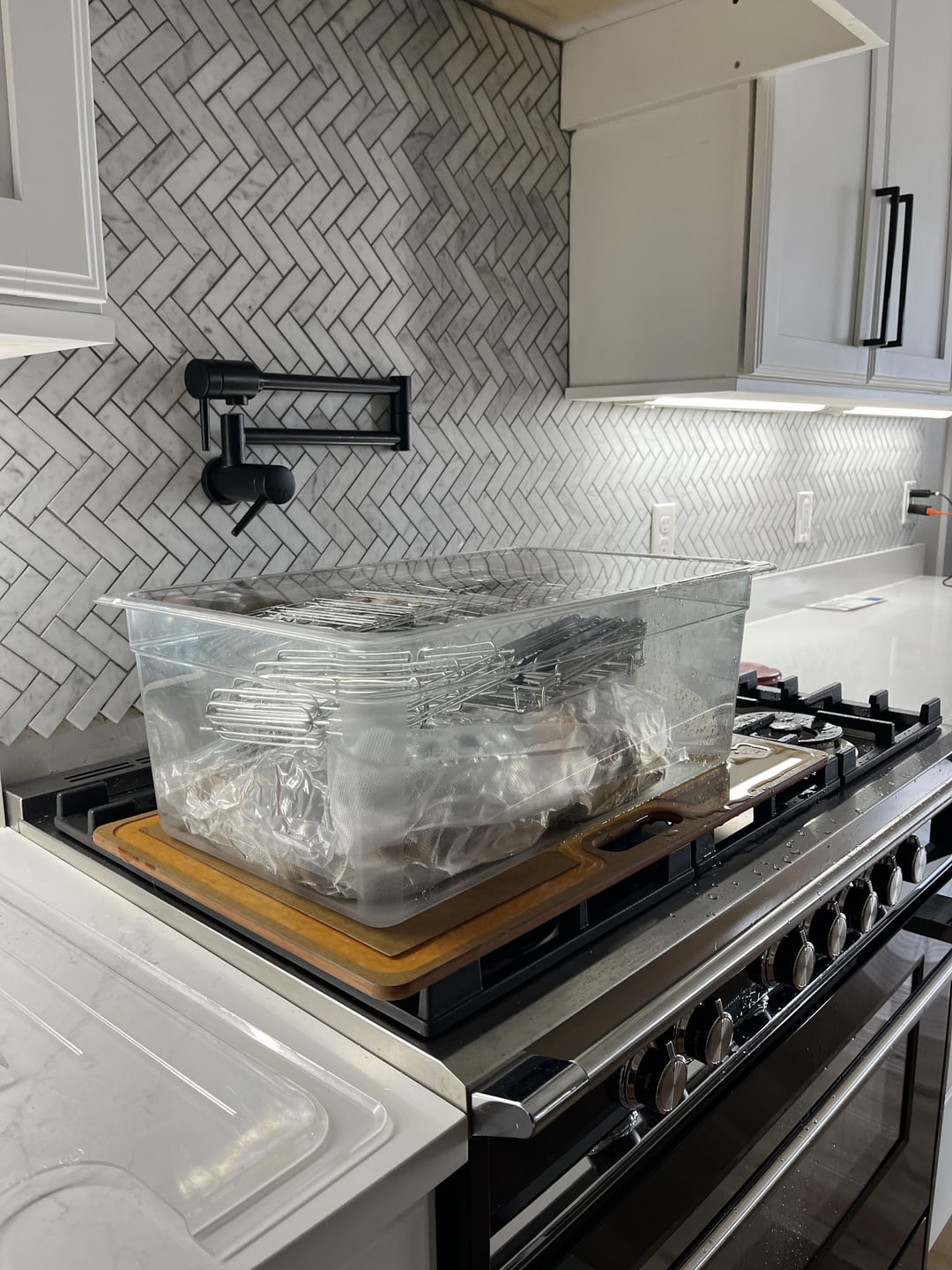 I do one of these from Costco every couple weeks. I got a 5 gallon food grade bucket and lid from Home Depot, cut a hole in the lid for the sous vide circulator, and it works really well for large cuts like that. The pack of 2 I get from Costco is usually about 15 lbs, so it’s a pretty big 7.5 lb piece of meat. 24-36 hours, 160-165.