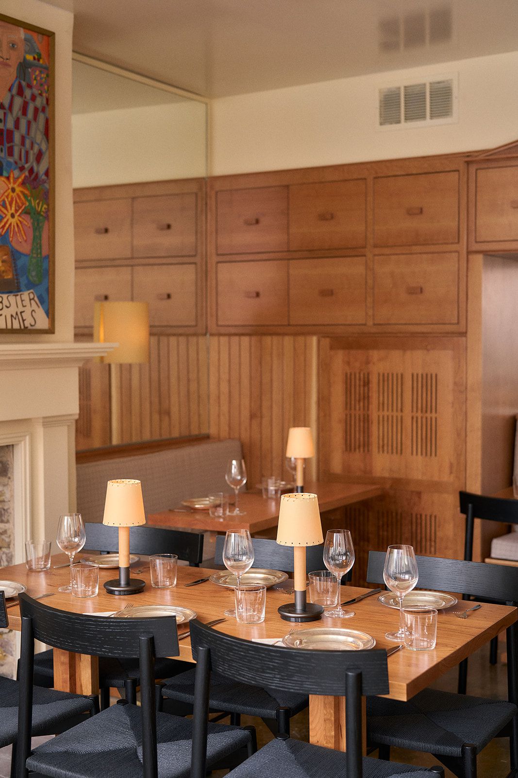 For the look of the dining room at Merci, the Zentners teamed up with the property owner and local designer Helen Rice to transform the 1820s Federal-style building into a bustling bistro. Rice helped them design the look of the neighboring market, Petit Merci, so they wanted to continue that aesthetic in the restaurant. The team worked with woodworker Brad Hubbard of the Knotty Log to create custom cabinets and tables. “The tables bring in an American heritage style to the room that makes the experience feel a little bit less formal,” says Courtney, “It feels a little bit more approachable while still being like fine dining.”