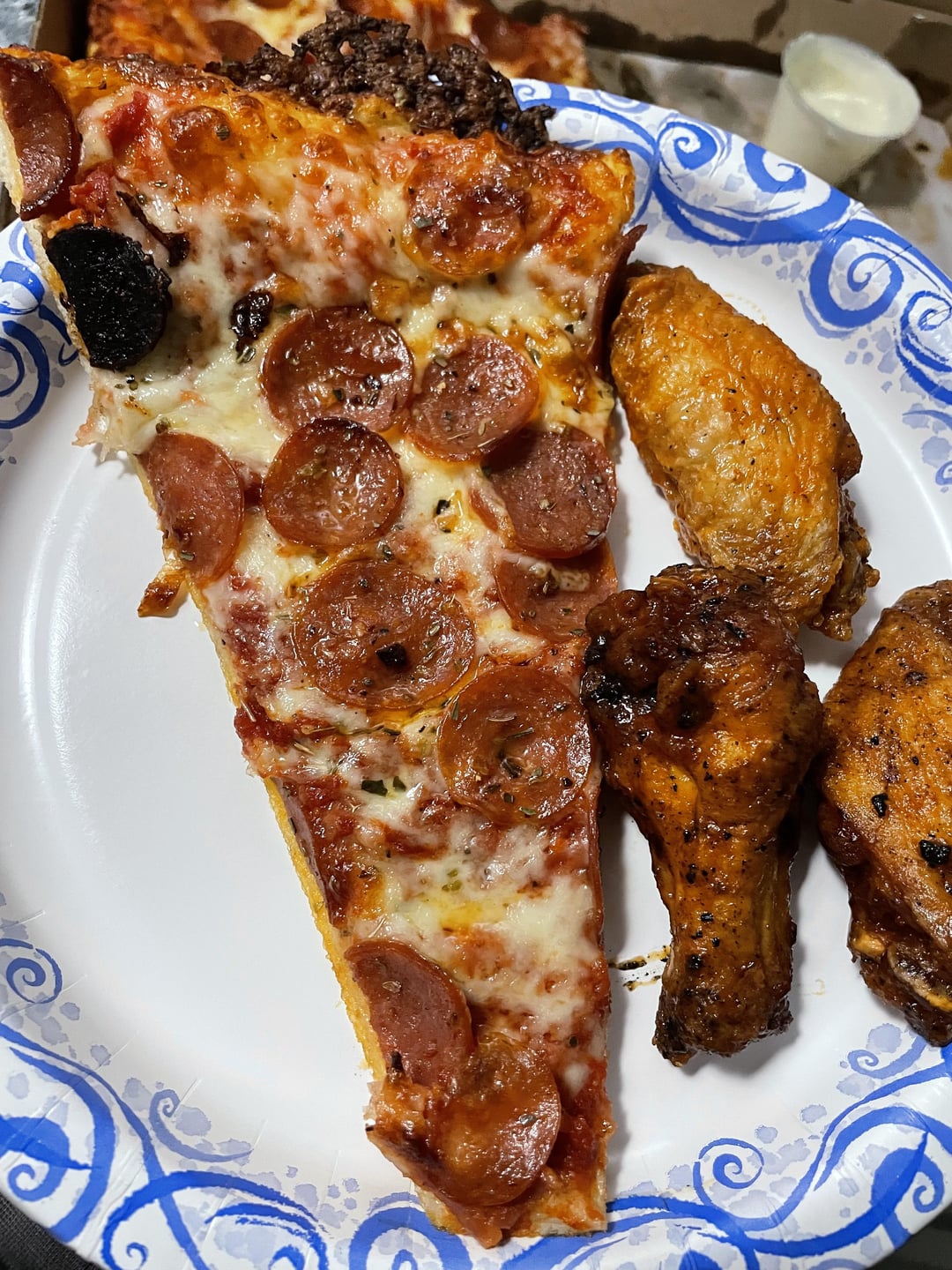 Oh god I just KNEW this was buffalo pizza and wings!!! Those little cups of grease are pure heaven. And those wings have clearly been kissed by a grill. I can taste this picture. I miss it so much…