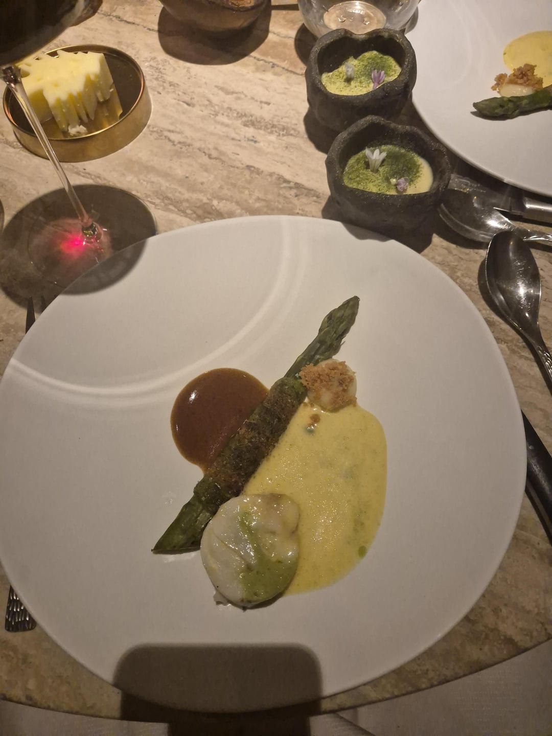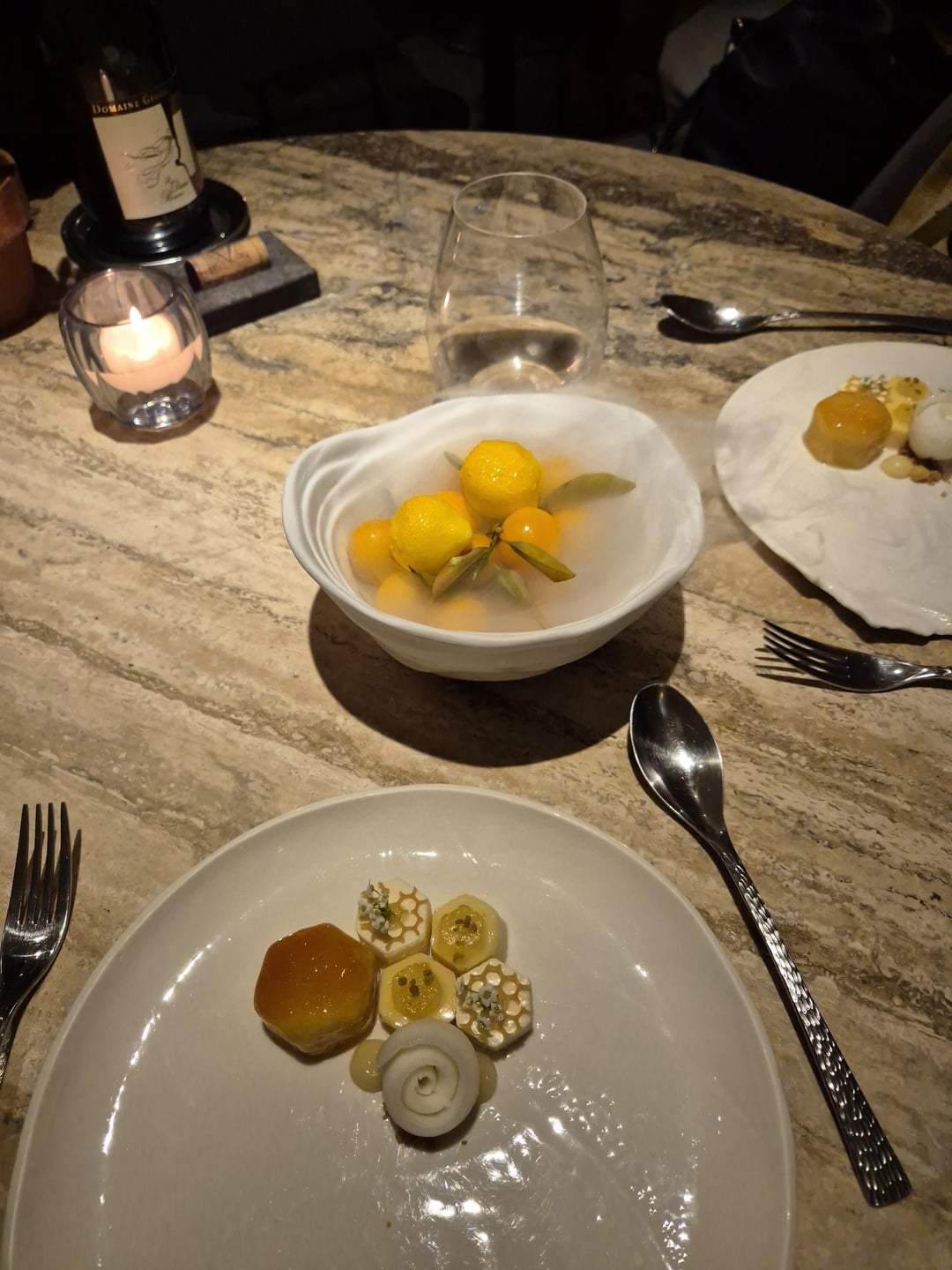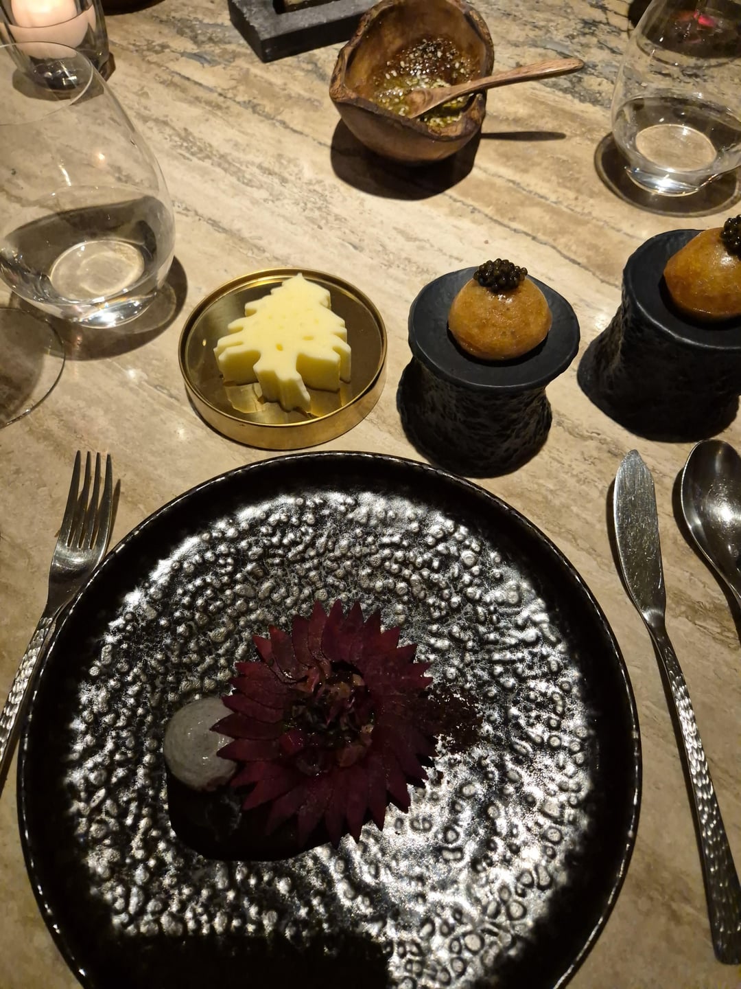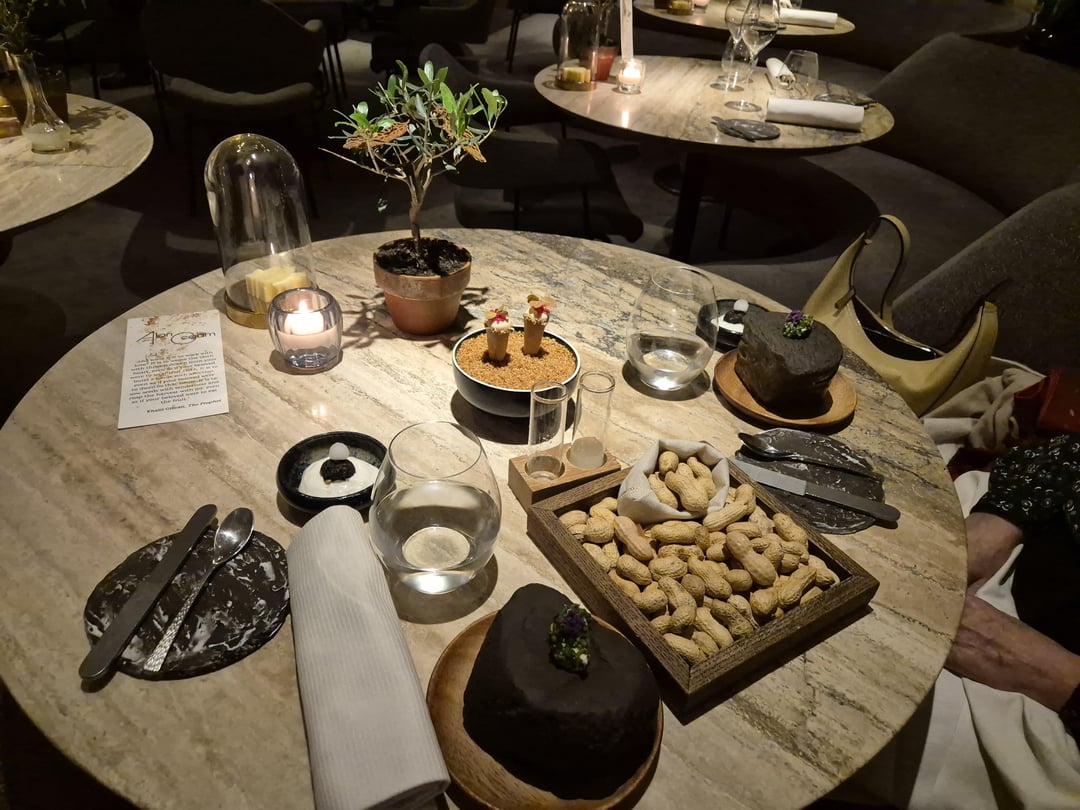 Contemporary French with a Lebanese twist. 1 orange blossom lemonade with crackers in olive tree. 2 Mezze amuse-bouche including 3 foie gras bonbons hidden in the nuts. 4 beetroot & tuna tartare, caviar on souffléd potato 5 langoustine Lebanese barbecue style 6 fish intro 7 bass, wild garlic, asparagus 8 meat intro 9 pigeon 10 dessert 11 honeycomb dessert (outstanding) 12 mignardises