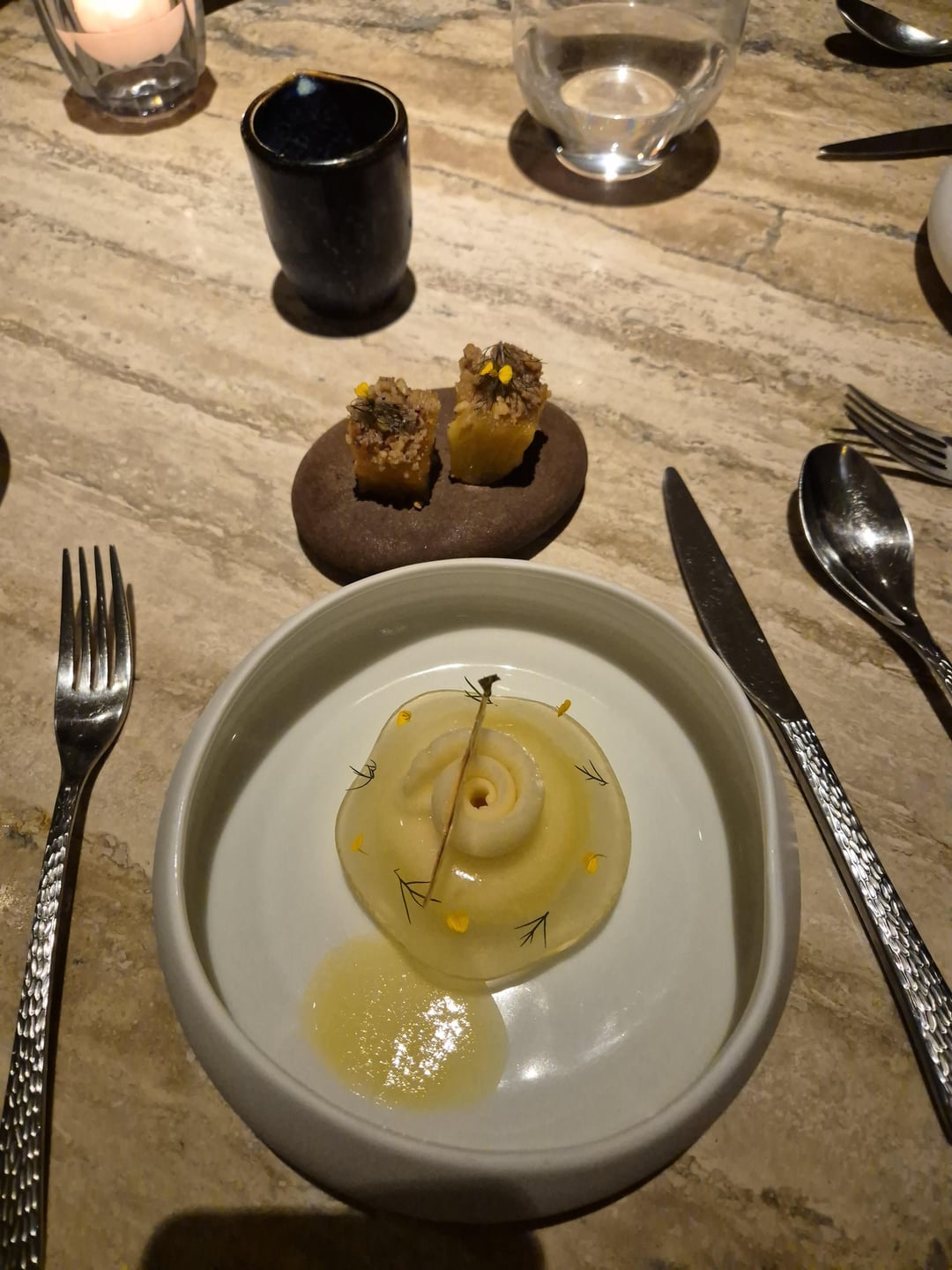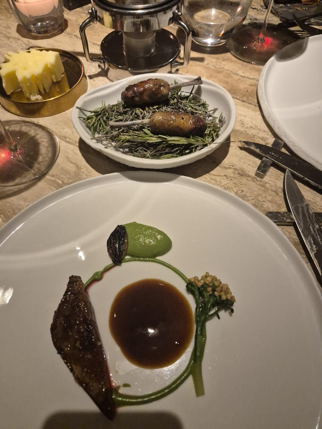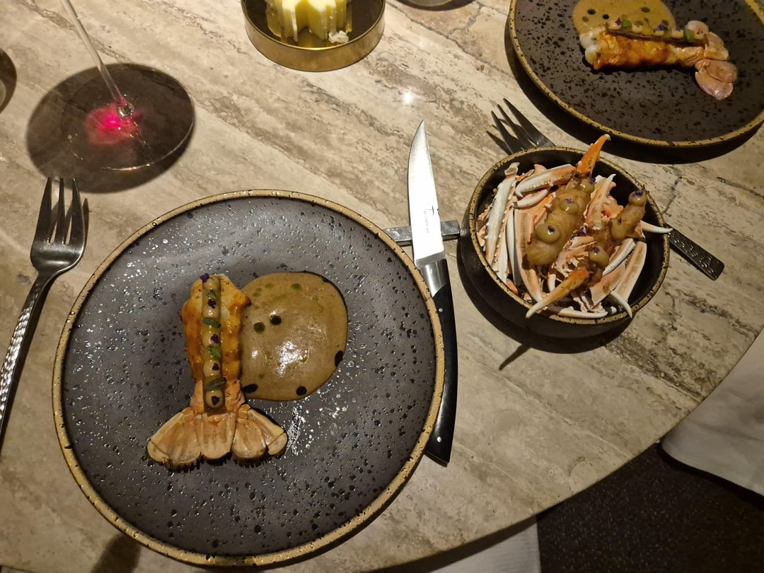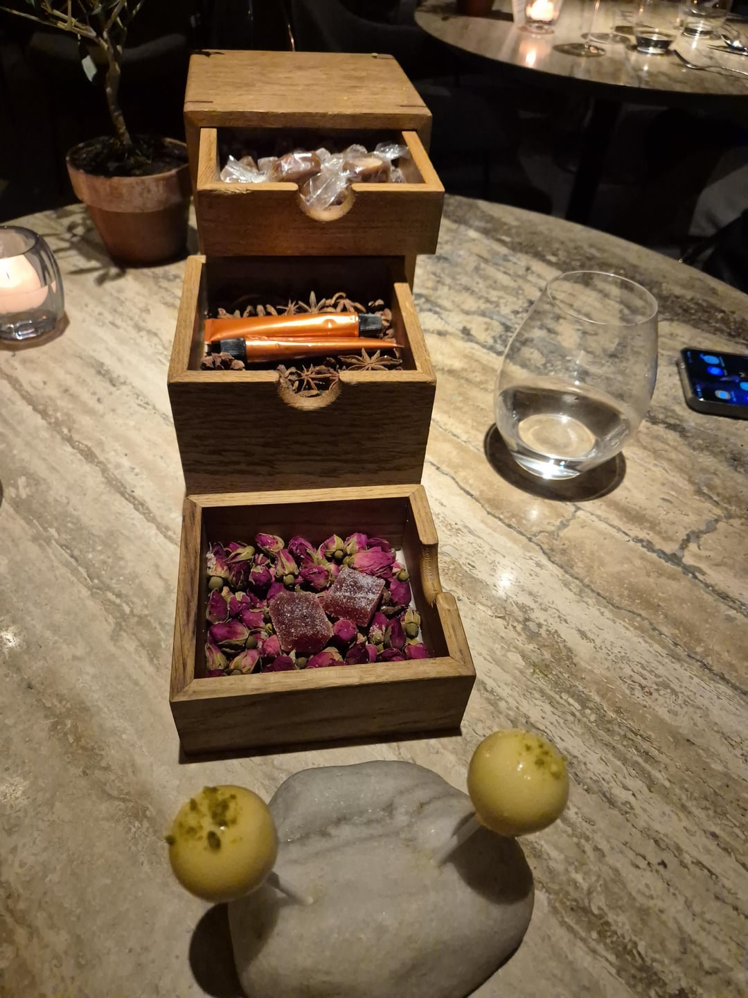 Contemporary French with a Lebanese twist. 1 orange blossom lemonade with crackers in olive tree. 2 Mezze amuse-bouche including 3 foie gras bonbons hidden in the nuts. 4 beetroot & tuna tartare, caviar on souffléd potato 5 langoustine Lebanese barbecue style 6 fish intro 7 bass, wild garlic, asparagus 8 meat intro 9 pigeon 10 dessert 11 honeycomb dessert (outstanding) 12 mignardises