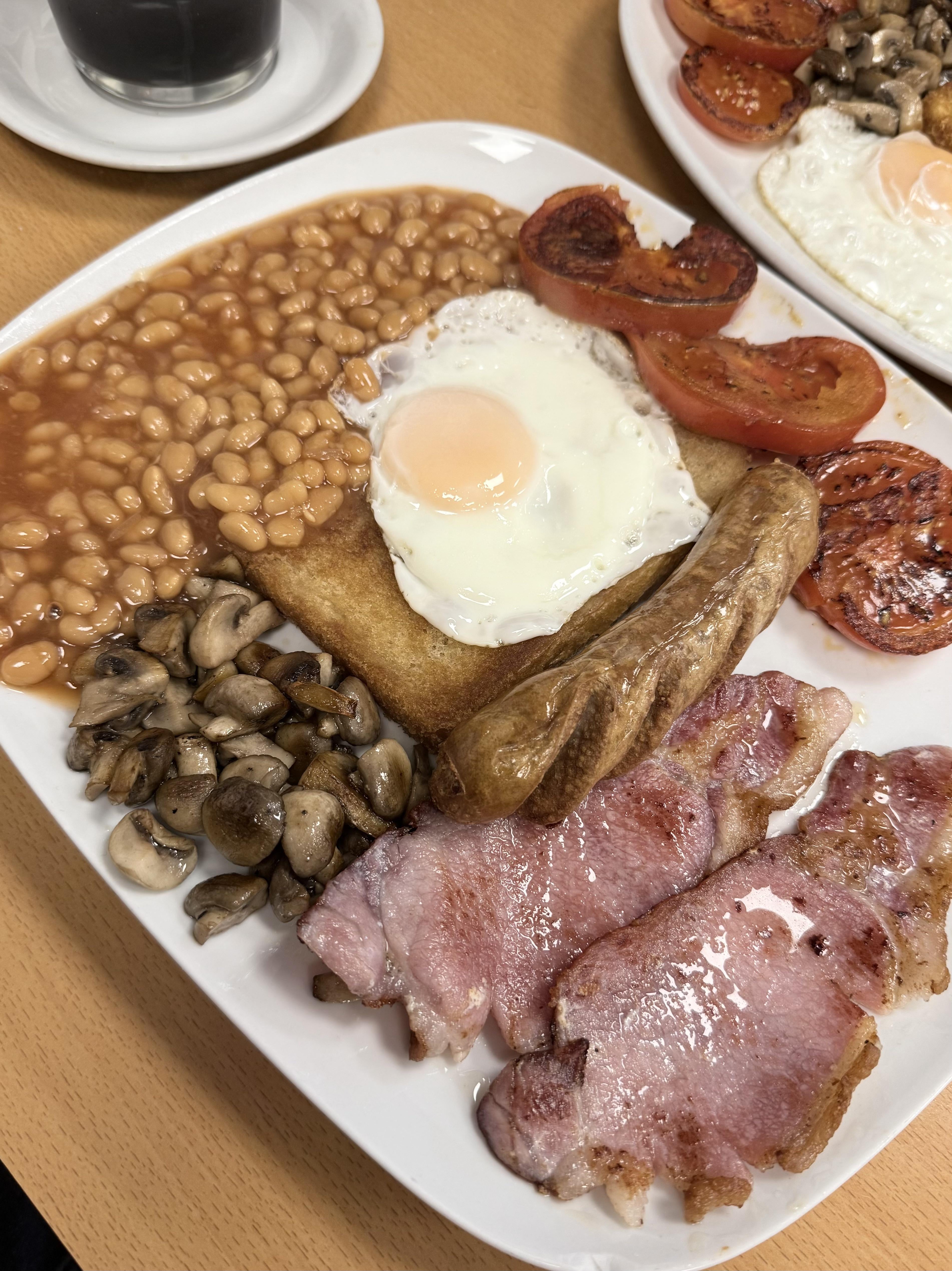 Full plate nicely set out. Only one egg and one sausage though. Bacon is glowing so fair. Toms look well cooked. Is that Fried Bread under the egg ? if so a massive plus ! Sea of beans. A wee bit watery but o.k. Mushrooms well cooked. Love oval plates . Could lap the bacon and give an extra sausage. No B.P. I would want a little more for the price TBH but looks great nosh.
