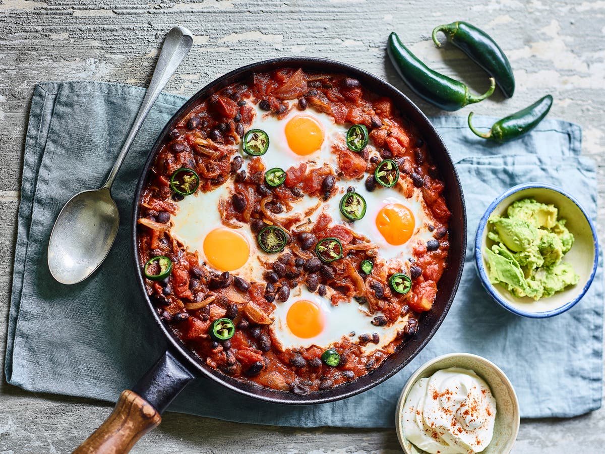 With main dishes perfect for any time of day, try the Mexican chilli baked eggs, creamy pasta with lots of basil or spring onion-miso relish on silken tofu.