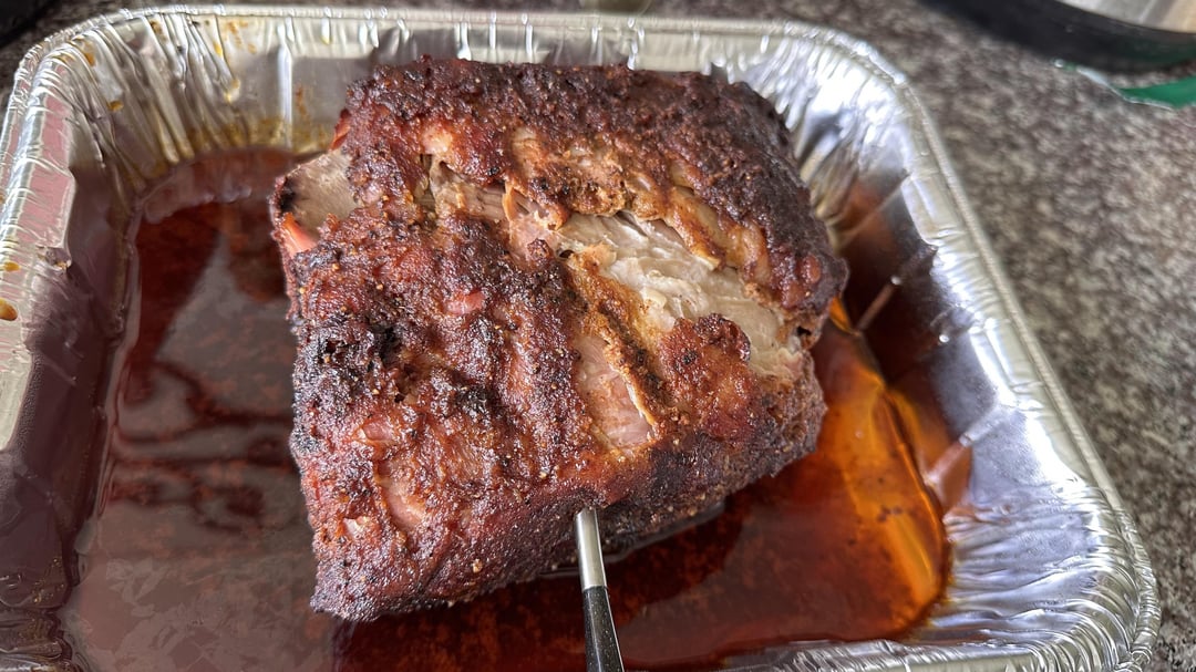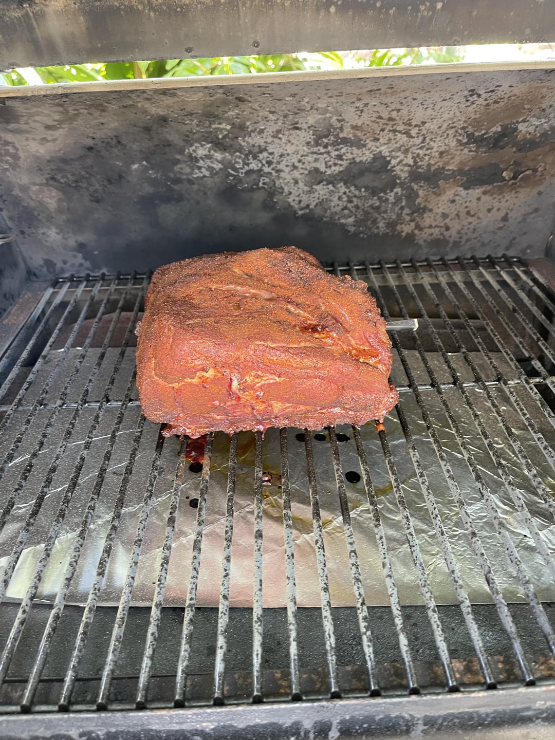 Out of the Traeger, unwrapped foil, and moved meat to a dish to extract juices from the alumi pan.