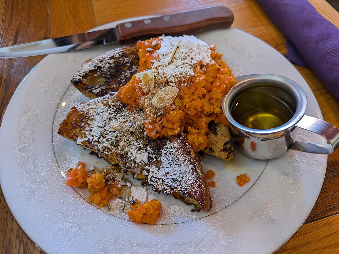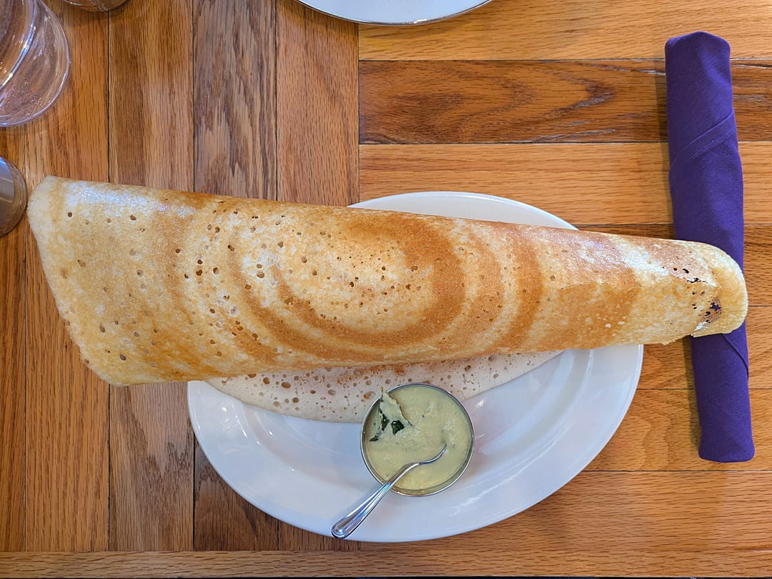 Really cute spot for brunch. My friend liked her French toast. I got the dosa and chutney. The dosa here was on the smaller side and unevenly spreaded, with very brittle center and thick, undercooked edges. It tasted a bit too buttery and needed more tartness. However, the coconut chutney was excellent: fresh, bursting with flavors with a good kick of spice. I wish they also served sambar on the side.