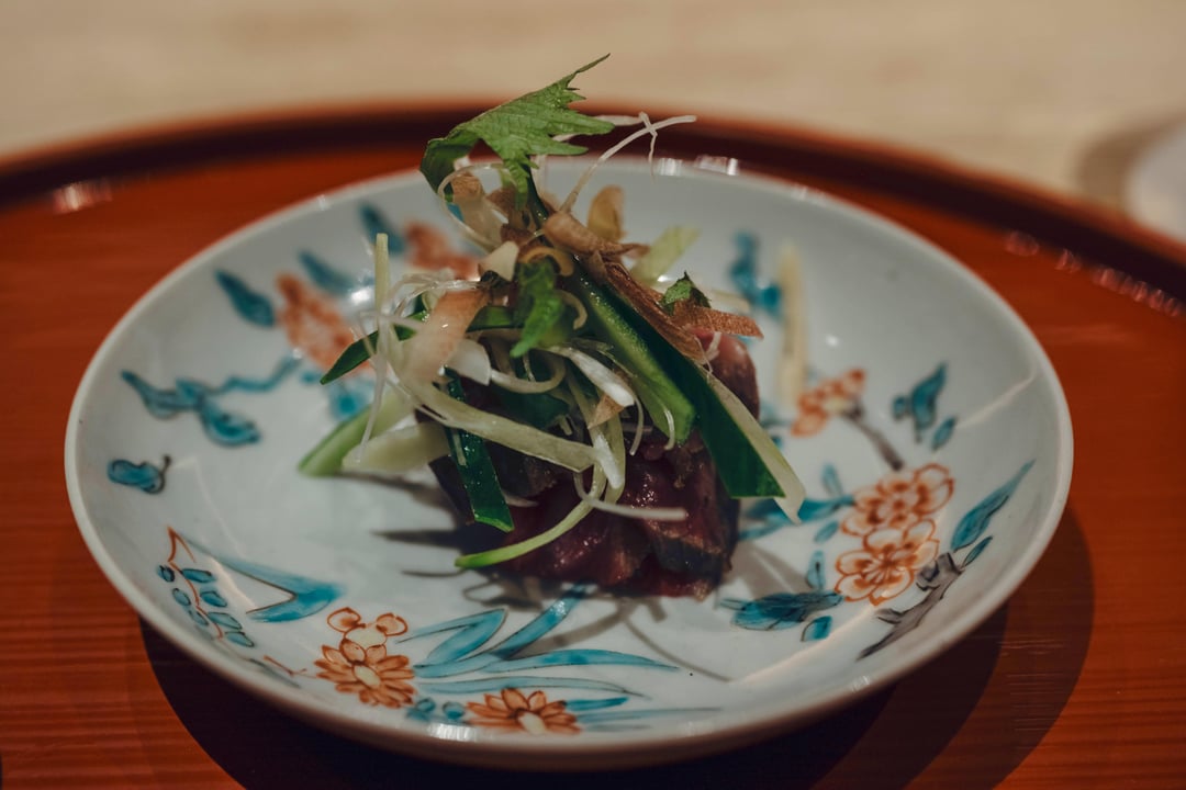 1. Kobu jime (kelp aged) Beef, takifugu roll: Tanaka san loves sushi, so he decided to serve up his special version for us. Kobujime is traditionally used for fish in Sushi to impart more flavour but beef is substituted instead. Full of umami, its got a chewy texture and rich in flavour a wonderful treat.