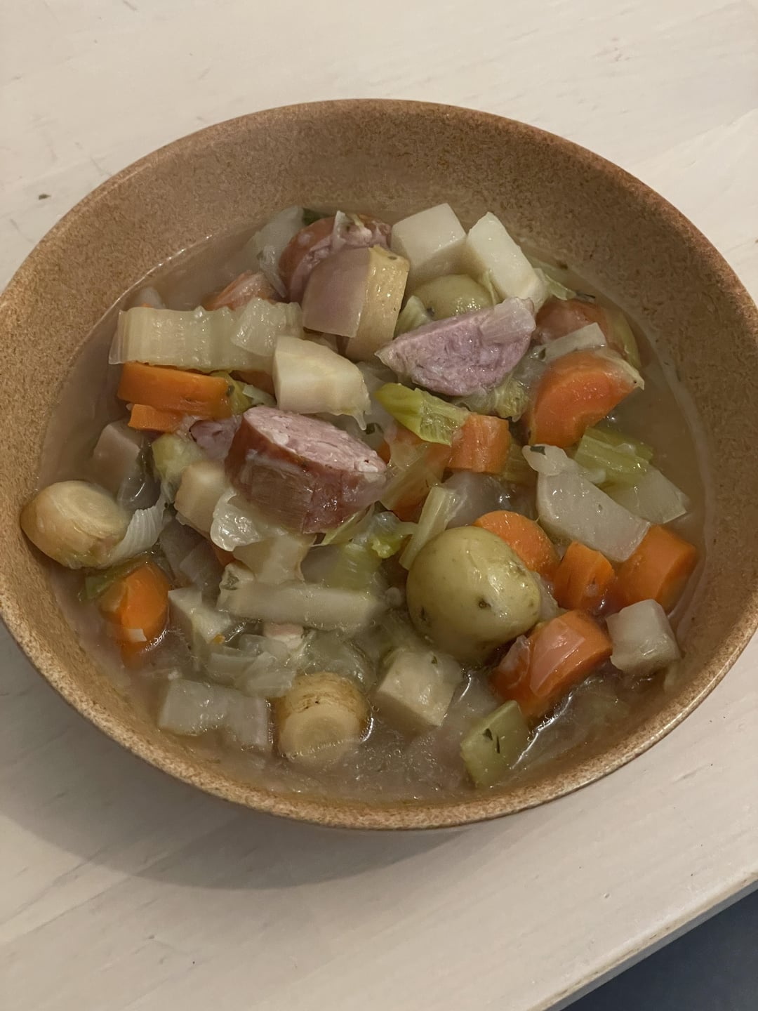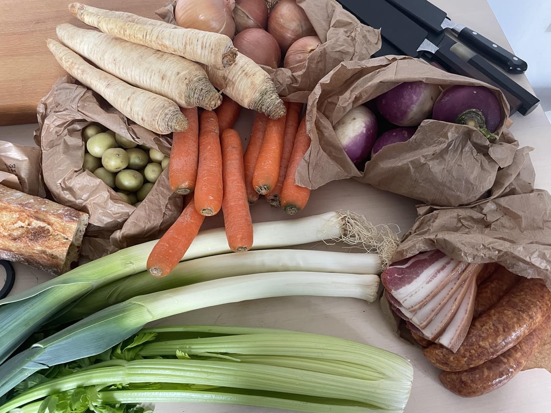 Add all the veggies and the sausages and 3 litres of boiling hot chicken broth