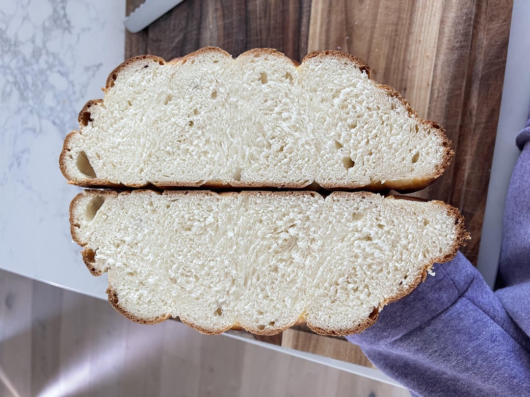 Decided to try making challah, only cut into it after a day bc I was busy making other food too and wanted to be able to appreciate it. Forgot the final rise, so I’ll be trying again soon. I used this recipe: https://houseofnasheats.com/best-challah-bread/#wprm-recipe-container-15040
