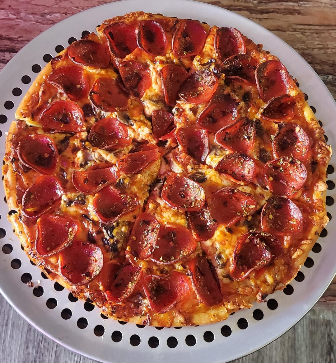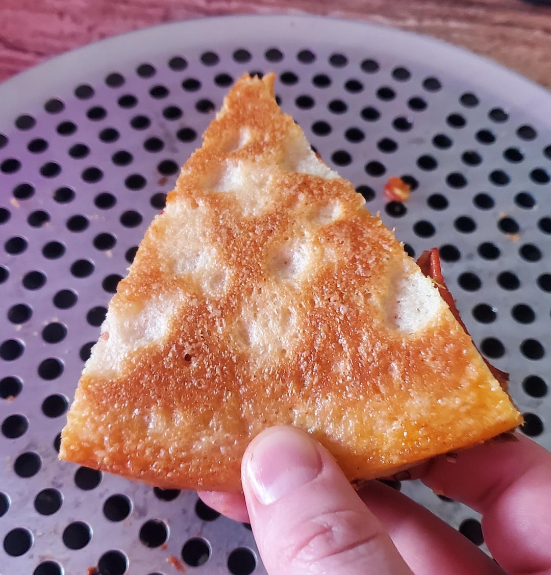 Pan pizza cooked then plated on a perforated pan over a plate for airflow.. Second picture might be indicative of no leftovers. 6 hour room temp ferment.