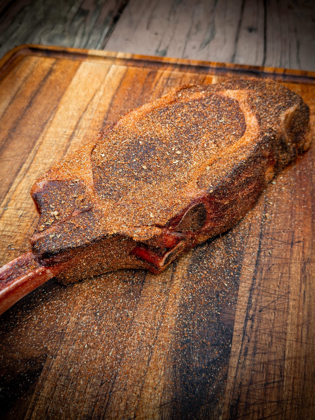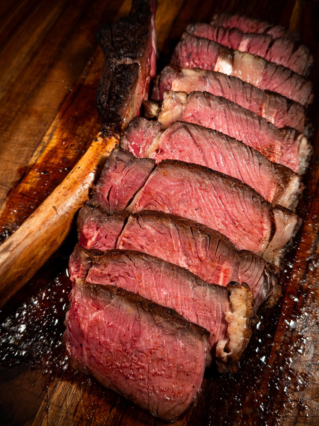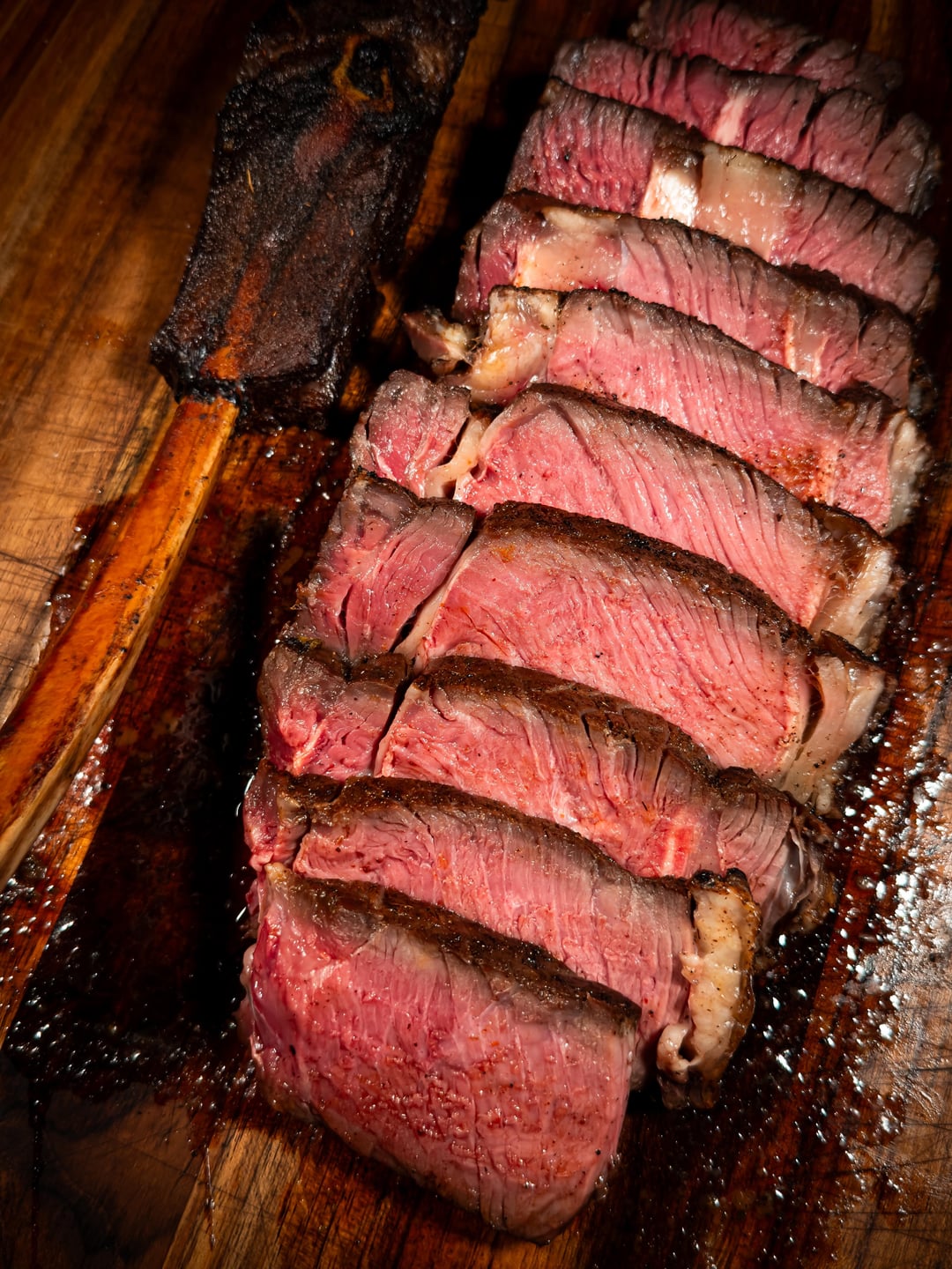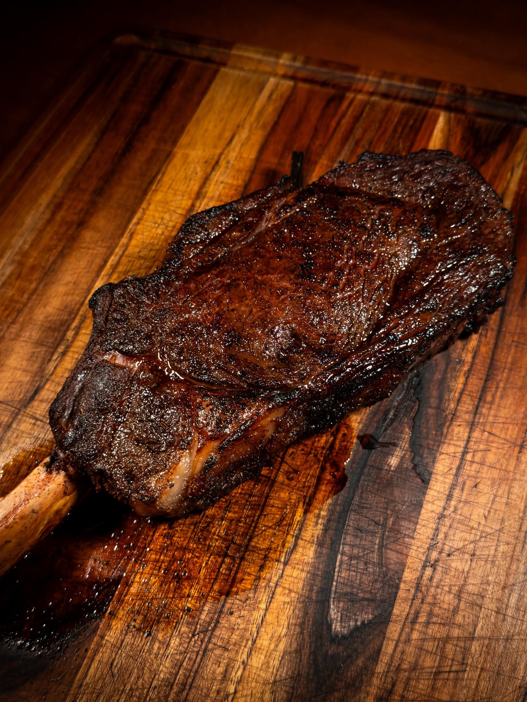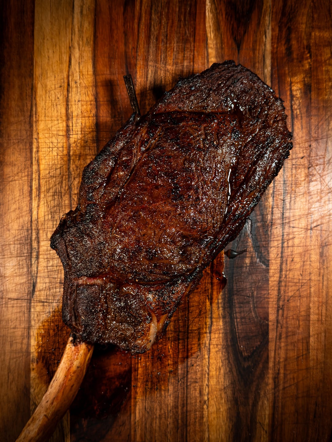 Beautiful bison tomahawk ribeye steak. Smoked over cherry wood to an internal temp of 110F, then seared over charcoal for 6 minutes and rested to a final internal temp of 134F.by TopDogBBQ Write A CommentYou must be logged in to post a comment.