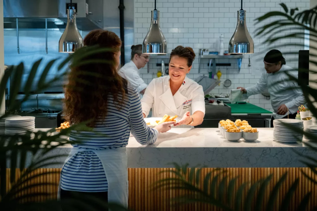 Chef Missy hands off a duck foie gras mousse appetizer at the pass. French Magnolia’s open kitchen offers guests a look into the bustling scene as Fraley’s team prepares a variety of French dishes.